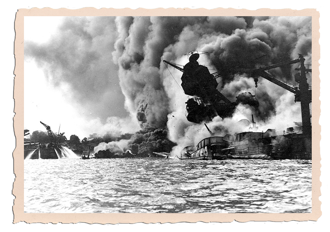 De Japanse bevelhebbers hebben hun strijdplan goed op elkaar afgestemd in 1941. Gelijktijdig met de verrassingsaanval op de Amerikaanse marinebasis Pearl Harbour op 7 december vallen Japanse troepen Hongkong, Singapore en Thailand aan. Na deze berichten verklaart Nederland op 8 december de oorlog aan Japan. De gouverneur-generaal van Nederlands-Indië maakt dit om 6.30 uur over de radio aan de bevolking bekend. Op de foto het brandende slagschip USS Arizona dat tijdens de verrassingsaanval van 7 december werd getroffen.