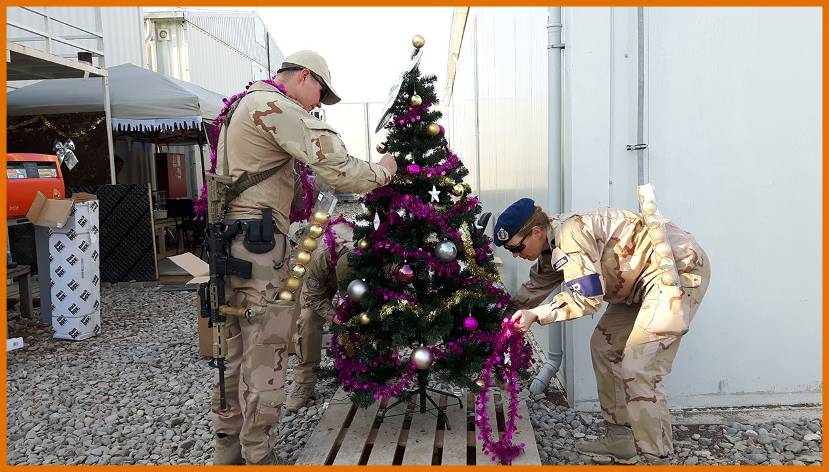 De 100 mannen en vrouwen van de Capacity Building Mission Iraq in Erbil werken tijdens de feestdagen gewoon door. De komende week wordt een training aan zo’n 150 Peshemerga afgesloten met een certificaatuitreiking. De volgende cursusgroep staat al ingepland. Toch wordt de kerst niet vergeten zoals op de foto is te zien.