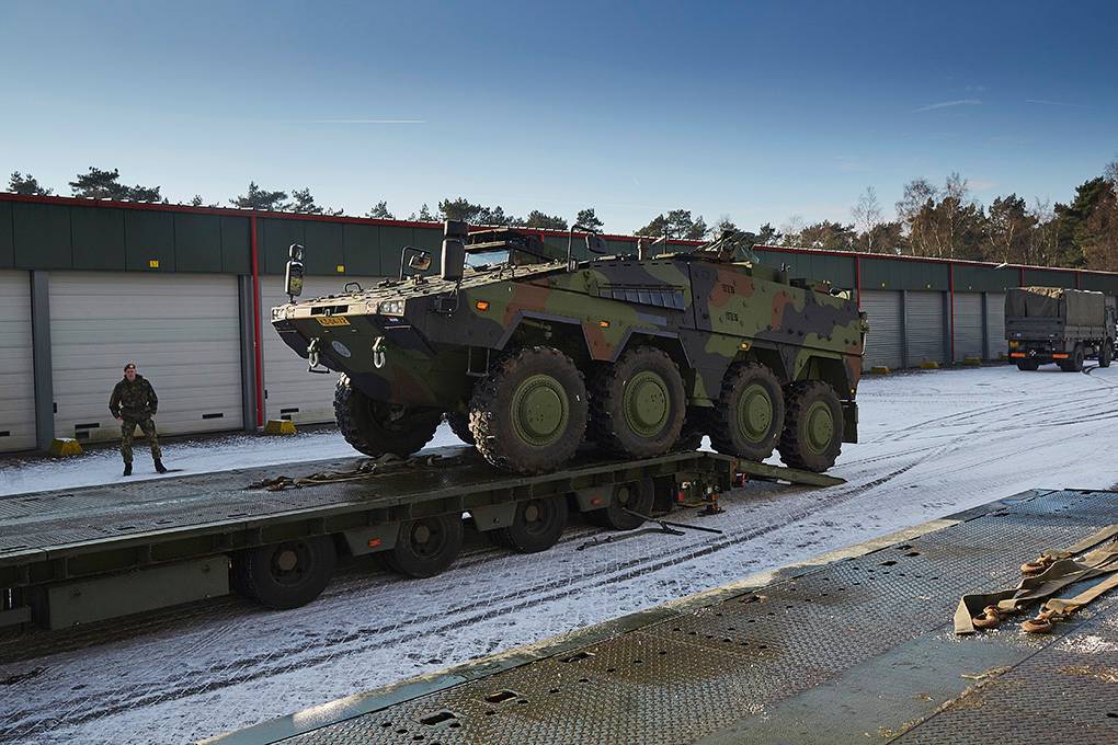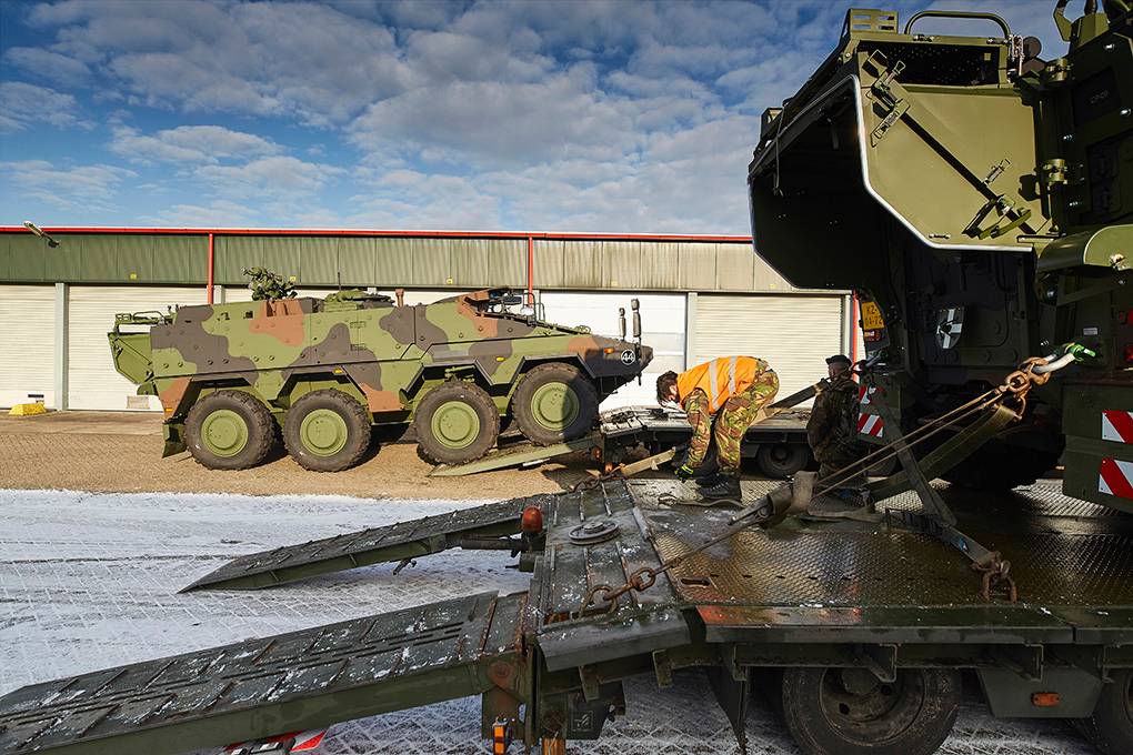 De 8-wielige zwaargewichten gaan met militaire precisie op een dieplader. Met evenveel accuratesse heeft beheerder sergeant 1 Mike van het 17e eerder de gehele inventaris gecontroleerd die achter de gepantserde kolos ligt uitgestald. “Want”, zegt adjudant Frans Verrijt van het Instroom Begeleidingsteam (IBT): “Wij moeten ervoor zorgen dat de klant alles piekfijn in orde krijgt aangeleverd, aan de hand van een detaillijst.”
