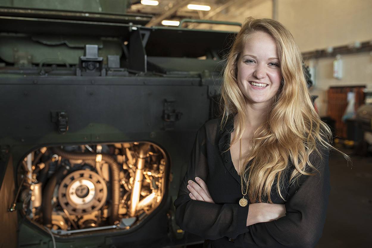 Jennie de Vries (24). "Ik zit in het 1ste jaar van de master Systems Engineering, Policy Analysis & Management aan de Technische Universiteit Delft. Bij mijn studie leer je een vertaalslag maken tussen techniek en bestuur, bijvoorbeeld bij grote bouwprojecten. Ik ben me aan het oriënteren op een afstudeerproject en functie bij Defensie. Het lijkt me heel leuk om daar te werken, omdat je als officier techniek meteen een leidinggevende rol krijgt. Ook spreekt het me aan dat je voor een nuttig doel werkt – vrede en veiligheid – en dat je fysiek bezig bent. Zaken die me aan het twijfelen brengen, zijn het feit dat je weer een opleiding moet volgen en dat je niet weet waar je wordt geplaatst."