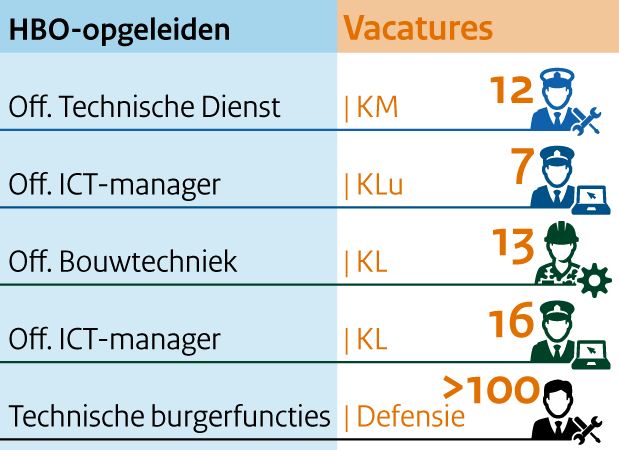 Defensie zoekt onder anderen officieren bouwtechniek, ICT en technische dienst. Bij deze functies gaat technische kennis hand in hand met militaire vaardigheden en leiderschap. Als officier bouwtechniek bij de Koninklijke Landmacht bijvoorbeeld sta je na een interne opleiding van anderhalf jaar op de Koninklijke Militaire Academie in Breda aan het hoofd van 45 militaire ‘bouwvakkers’ van de genie. Een deel van de militaire functies is extra aantrekkelijk gemaakt met een premie bovenop het salaris.