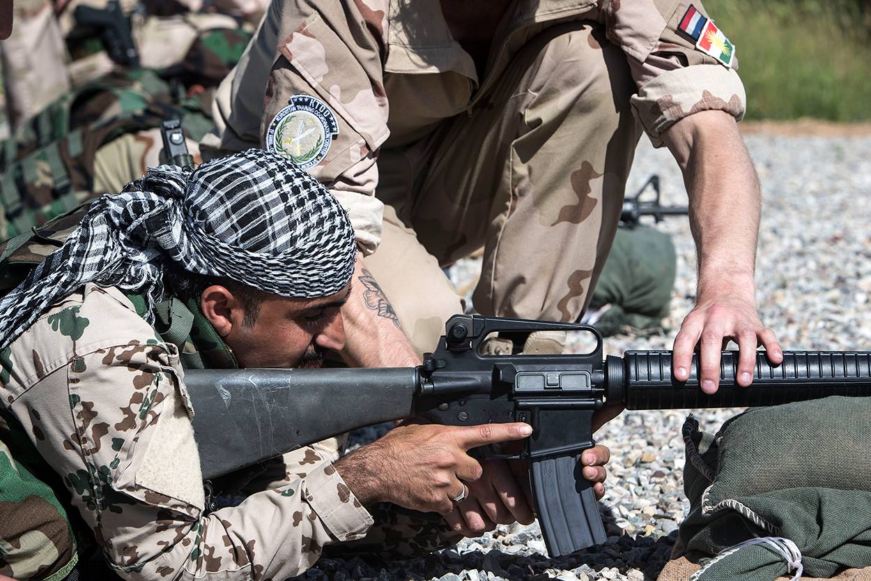 Een Nederlandse trainer legt een Koerdische strijder uit hoe hij de meeste treffers kan boeken met zijn nieuwe wapen, de M16. Hoofdschietinstructeur sergeant Niek vertelt later: “Dit zijn gewoon hele goede buksen. Terwijl we ook Kalashnikovs uit 1948 voorbij hebben zien komen. Die rammelden natuurlijk aan alle kanten.” Hij vervolgt: “Op de baan let ik het meest op de veiligheid. Niemand voor de buks, veilige handelingen en niet omdraaien met het wapen. En natuurlijk schiethouding, richten, ademhaling en afdrukken. Na een dag als deze zijn ze je erg dankbaar, want je leert ze toch maar even mooie groepjes (dicht bij elkaar liggende treffers, red.) te schieten.”