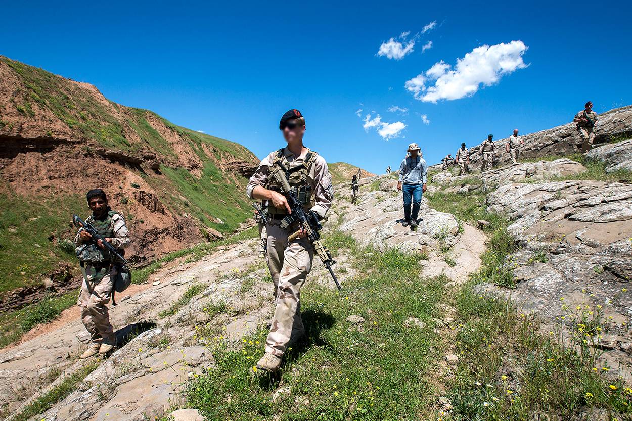 Op locatie ‘Viking’ werken naast Nederlandse mariniers ook onder andere Noren, Finnen en Britten. Op de foto trekt een peloton Peshmerga’s door de heuvels, verschillende vormen van pelotonsformaties beoefenend. Eerste luitenant der mariniers Simon, die even daarvoor de theorie had uitgelegd, zegt achteraf: “Sommigen keken heel goed de juiste kant op, hielden hun wapen op de goede manier vast en namen de correcte tussenafstand in acht. Dat ze niet een hele mooie formatie lopen, dat is nu eenmaal niet anders. We streven naar het best mogelijke resultaat.”