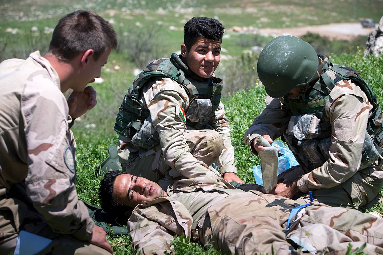 Bij geneeskundige hulp is in Noord-Irak nog veel winst te behalen. In het gespeelde scenario op de foto wordt een zwaargewonde Peshmerga behandeld die net op een bermbom is gelopen. Je kunt zien dat hij nog wel zelf een tourniquet heeft kunnen aanleggen. Zijn collega’s verlenen nu eerste hulp en laten een helikopter aanrukken om de strijder zo snel mogelijk naar het ziekenhuis te laten vliegen.