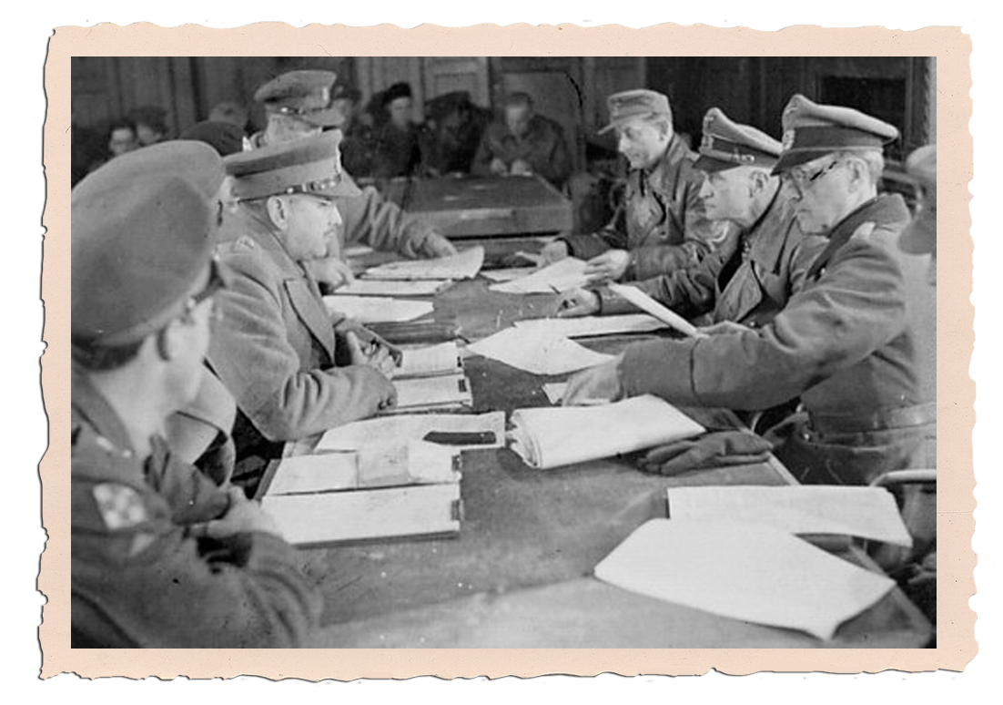De ontmoeting in Hotel de Wereld in Wageningen. Links, met de handen op tafel: Charles Foulkes en rechts, de middelste van de drie: Johannes Blaskowitz. Links vooraan Prins Bernhard. Bron: Wikimedia Commons