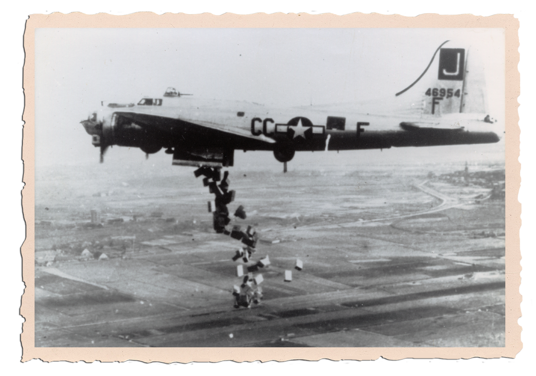Een B-17 dropt voedselpakketten boven Valkenburg. Bron: Nederlands Instituut voor Militaire Historie