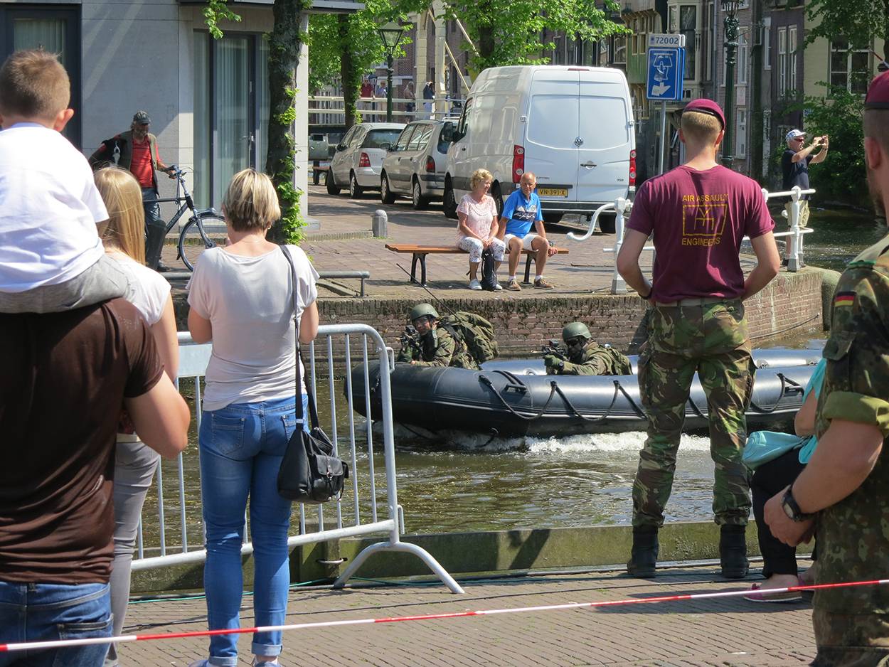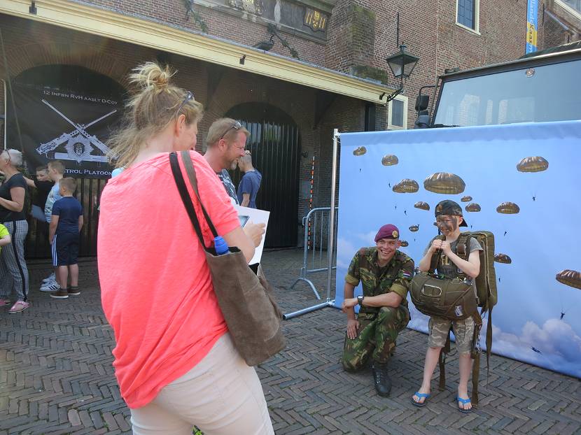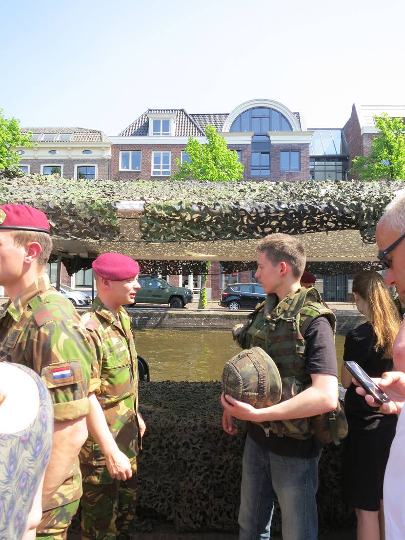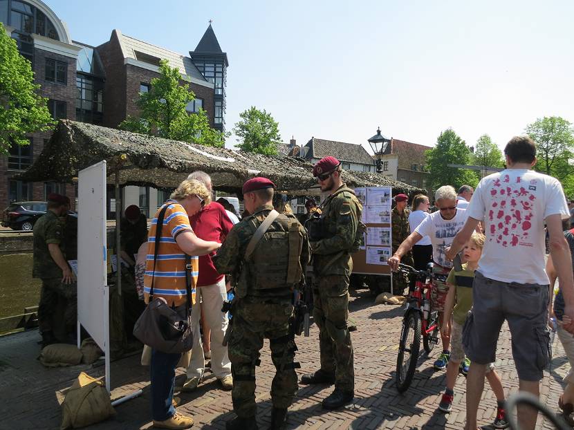 Naast kramen vol met wapens en uitrusting en informatie over de opleiding, missies en oefeningen stond een veldhospitaal en militaire voertuigen. Er waren eveneens demonstraties en liefhebbers konden mee in een stoere boot voor een tocht over het water. En wie naar boven keek zag zo af en toe zelfs een (goedaardige) sniper op het dak. Met op de achtergrond de top van de kerktoren met daarop de tekst; ‘Vive memor leti fugit hora’. Dat zoveel betekent als ‘Het leven op aarde is kort, dus accepteer de dood’. Een spreuk die misschien wel meer op onze dappere militairen slaat dan wat dan ook.