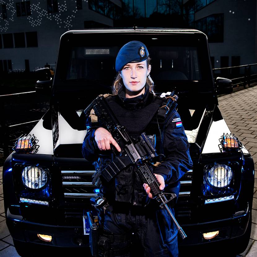 “Wij zijn de maatregel die Nederland heeft genomen in een poging de veiligheid te verhogen,” zegt de 22-jarige marechaussee-1 Kristel. De hoog risico beveiliger is zich bewust van de verantwoordelijkheid die op haar rust. “We beschermen risicogevoelige objecten zoals overheidsgebouwen en Joodse instellingen tegen terroristische aanslagen.” Met haar werk bij de Koninklijke Marechaussee treedt ze in de voetsporen van haar vader, die er ooit ook zijn carrière begon.