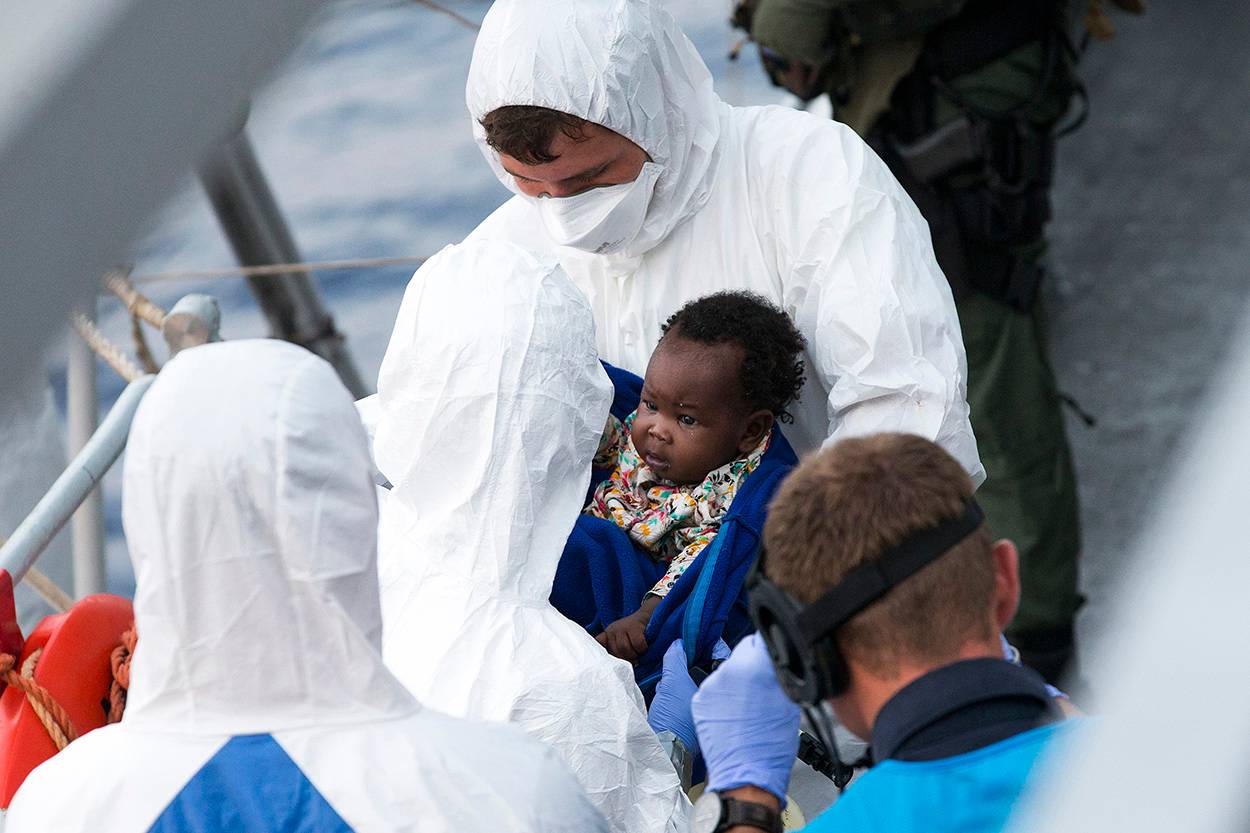Ze ondergaan eerst een medische check. Voor hun veiligheid zijn degenen die langdurig met de migranten in aanraking komen gehuld in beschermende kleding. Het vormt een bescherming tegen besmettelijke aandoeningen waartegen westerlingen geen weerstand tegen hebben.