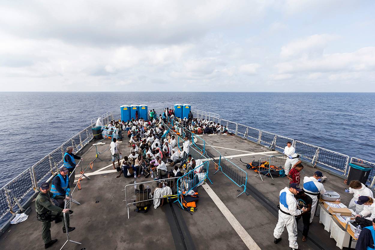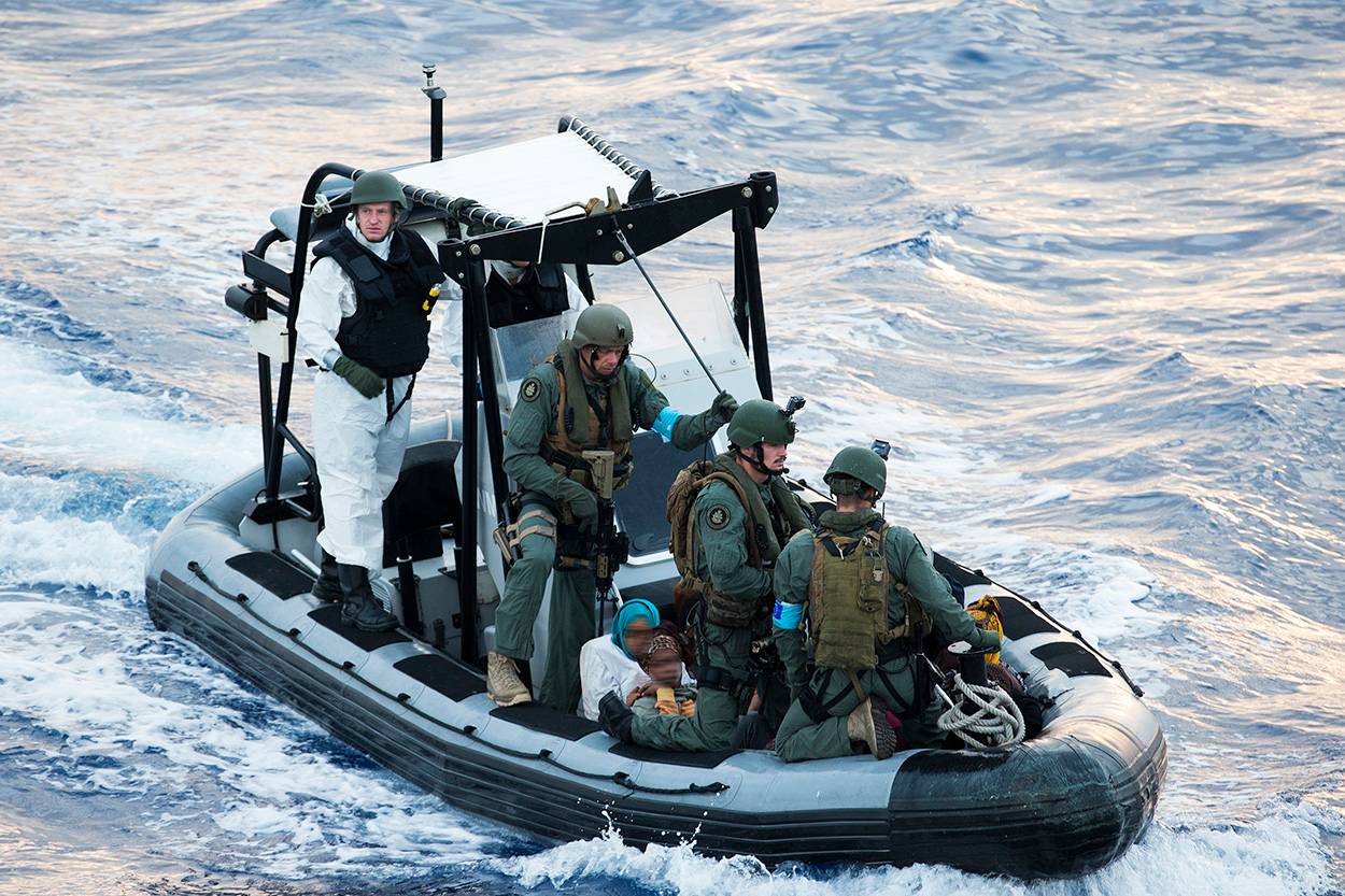 Die snelle motorbootjes van de marine nemen een voor een 10 opvarenden mee naar de Van Amstel. Wat verdwaasd komen de migranten aan boord. Eerst vrouwen en kinderen en een paar gewonden. Dan de mannen. Sommigen met een rugzak, anderen weer zonder bezittingen of slechts een fles water. De een op blote voeten, de ander met nieuwe Timberlands.