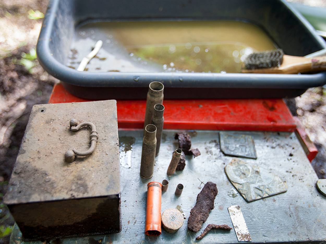 Een roestige haarspeld, een musketkogel, een geldkistje en enkele hulzen. Genisten van 13 Lichte Brigade hebben van alles gevonden in het Baarnse Bos. Nauwkeurig kamden ze een bosperceel uit op zoek naar sporen van een oorlogsdrama uit 1945.