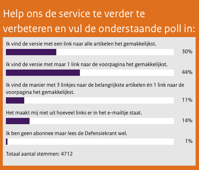 Wat waren de mogelijkheden ook al weer? In de nieuwsbrief, de e-mail die een seintje geeft dat er een nieuwe Defensiekrant is verschenen, stonden altijd 4 links om naar de krant te gaan. Daarvan verwijzen er 3 naar de volgens ons meest interessante artikelen uit de Defensiekrant en 1 naar de voorpagina. Dat was de 1e optie. De 2e optie die we lieten zien was één link naar de indexpagina zodat je kon bladeren door het hele blad en de 3e optie vormde links naar alle redactionele artikelen.