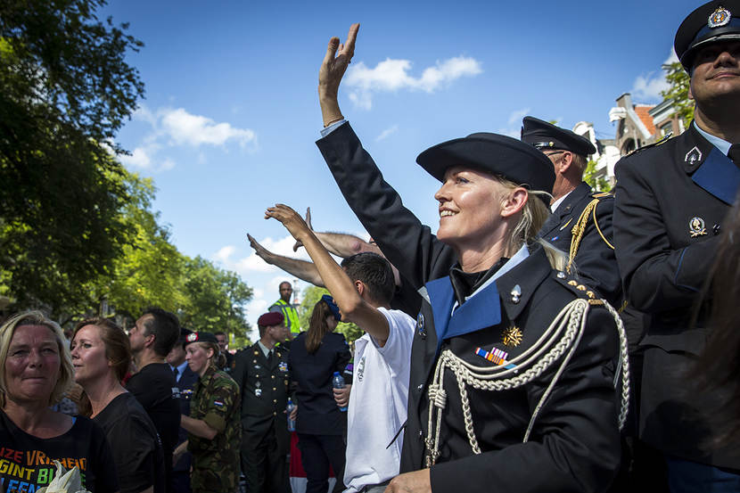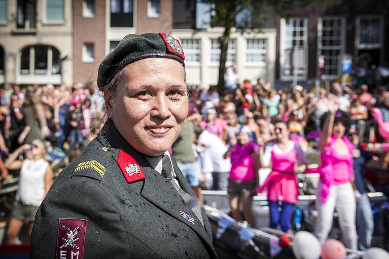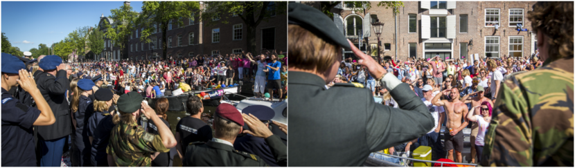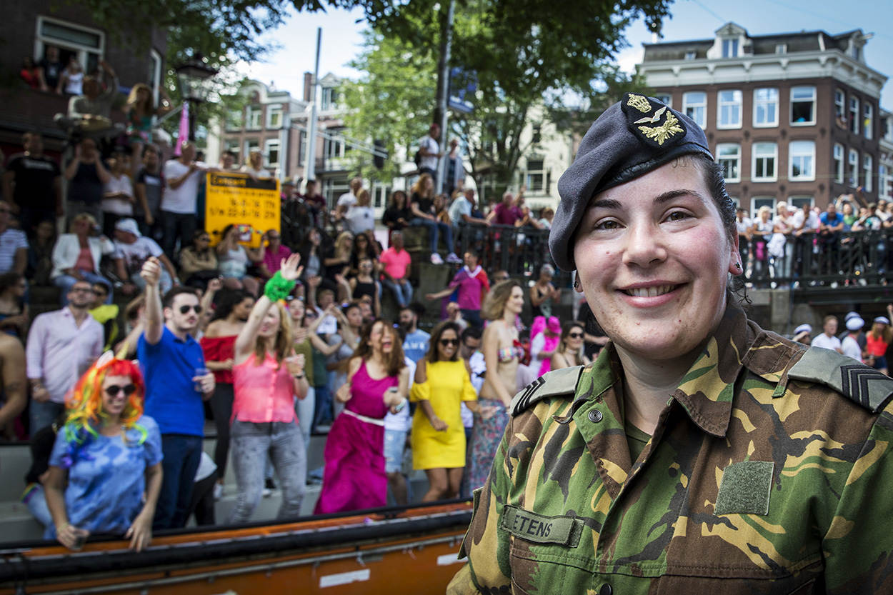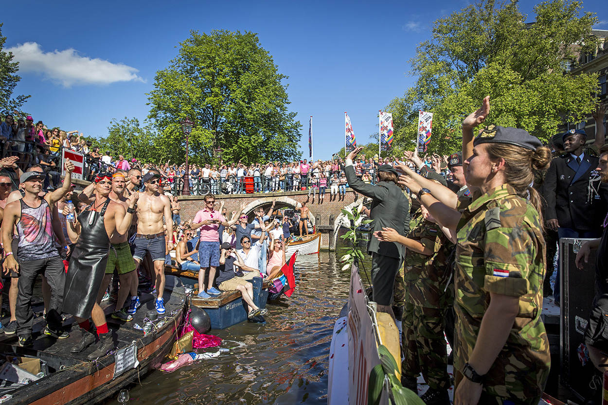 Ondanks dat er nog een hoop te winnen valt, is de Nederlandse krijgsmacht wereldwijd het verst op het gebied van LHBTI-emancipatie. Enkele jaren geleden adviseerde de SHK zelfs op verzoek de Amerikaanse krijgsmacht over de sociale en juridische omgang met LHBTI-personeel. Kort daarop schafte de grootmacht haar ‘don’t ask, don’t tell’-beleid af en richtte het LHBTI-netwerk OutServe op. Een aantal leden daarvan voer afgelopen zaterdag mee over de Amsterdamse grachten.