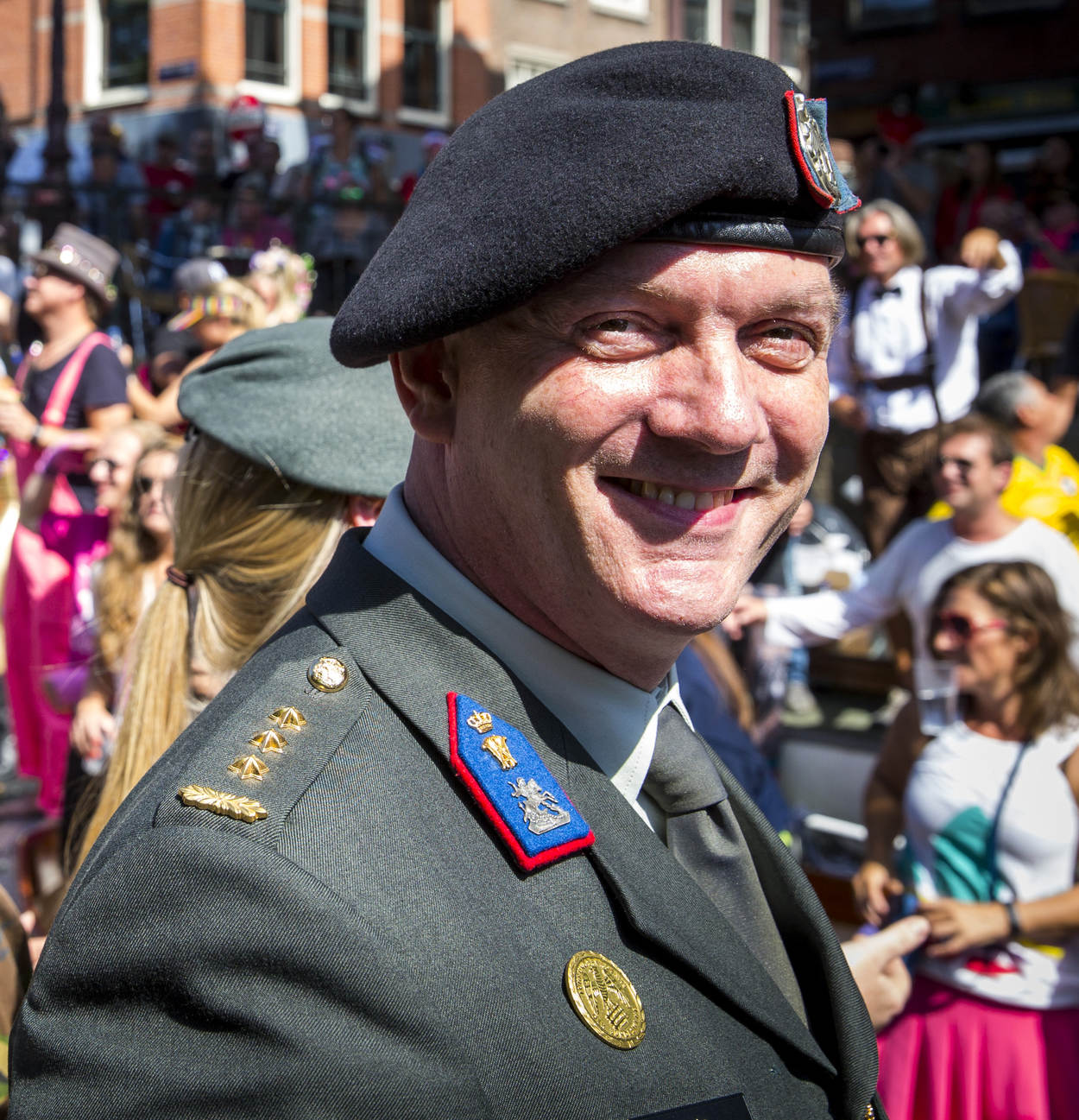 Defensie is voor het zesde jaar op rij een opvallende verschijning in de bonte stoet van 80 boten. Het publiek toont met een stilte gevolgd door gejuich respect voor de saluerende militairen aan boord. “Ik krijg hier zo’n energie van”, zegt de lesbische sergeant Sharon Suetens met kippenvel op haar armen. “Het voelt alsof de menigte ons op handen draagt.” Ook Broks is onder de indruk van de reactie van het publiek. “Volgens mij hebben we als Defensie op een ingetogen maar feestelijke manier de pride-gedachte uitgedragen.”