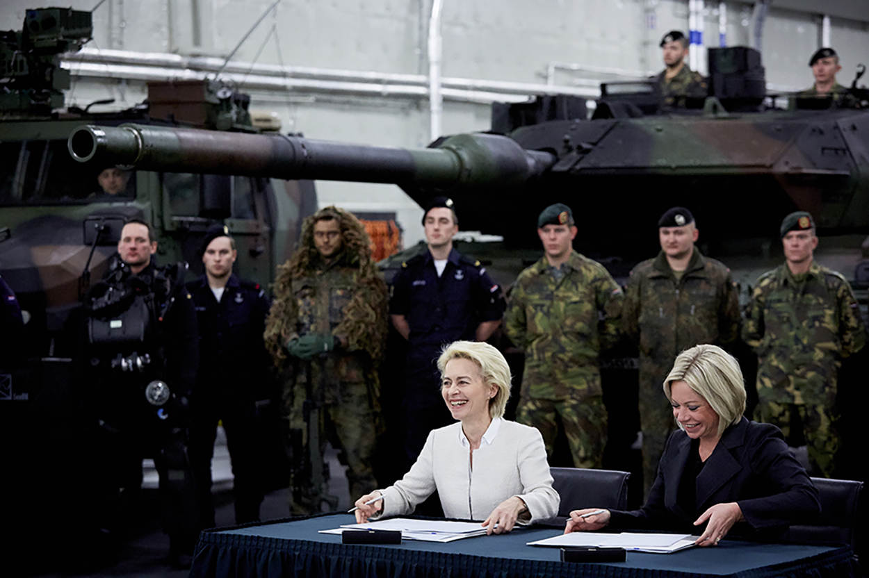 Ministers Hennis en Von der Leyen ondertekenen de Letter of Intent voor nauwere samenwerking aan boord van Zr.Ms. Karel Doorman. Op de achtergrond een Leopard 2A6