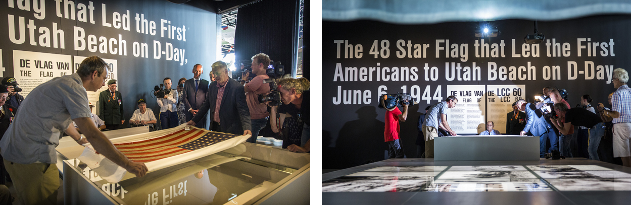 Eerbiedig plaatst conservator van het Nationaal Militair Museum Paul van Brakel de D-day vlag als middelpunt in de speciale expositie. Daarna memoreert hij het belang van dit speciale object: “Dit is de getuigenis van het keerpunt in de Tweede Wereldoorlog. Deze vlag markeert het begin van de bevrijding van West-Europa.”