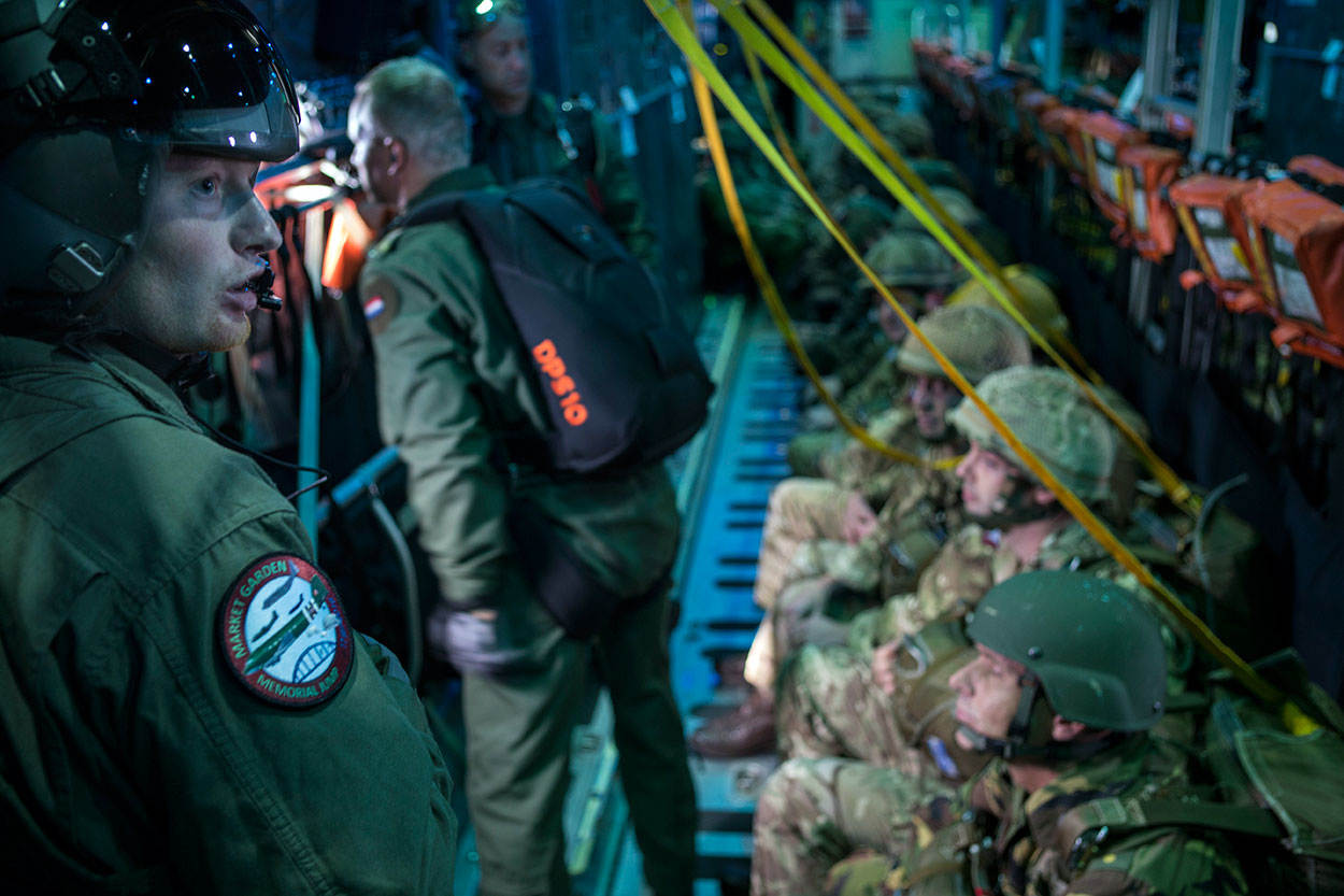 Bijna 72 jaar na dato staat lance corporal Gavin Phillips van het Britse 216 Signal Squadron in de buik van een transportvliegtuig. “Dan kijk je links en rechts naar je airbornebroeders”, vertelt de Brit die samen sprong met militairen van 11 Luchtmobiele Brigade. “De spanning neemt toe en dan spring je, met je Nederlandse collega’s. Het uitzicht is fantastisch. Het is een eer mee te springen bij de herdenking.” Soldaat-1 Arjen is zich ook bewust van de emotionele lading. “Ik heb me verdiept in wat er toen is gebeurd. Ik wilde daar wel een beeld van hebben.”