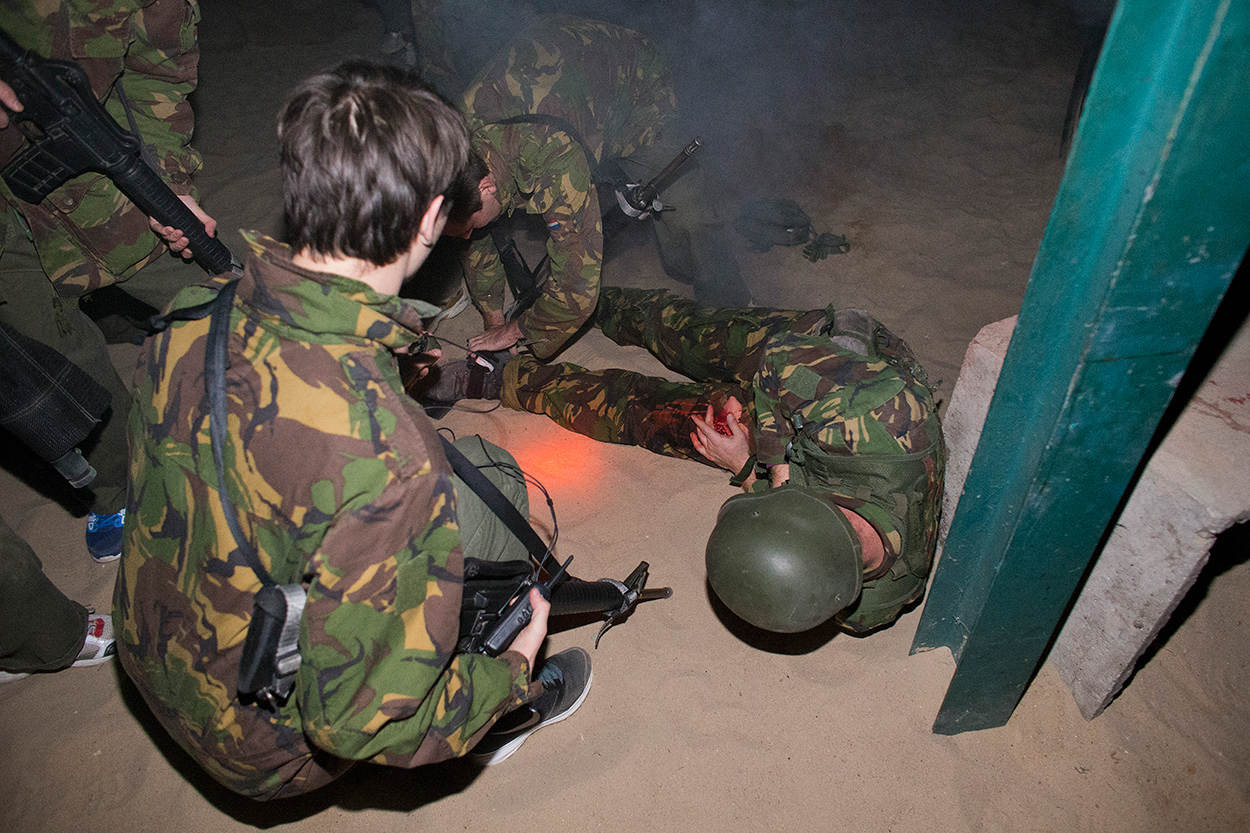 ‘s Avonds worden ‘de spijkerbroeken’ direct in het diepe gegooid met een ‘rescue and return-missie’. De opdracht: haal 2 gewonde militairen op in vijandelijk gebied. Na een korte uitleg over het gebruik van de ‘CAT’ (combat tourniquet) om een slagaderlijke bloeding te stoppen, gaat het team het skillslab in. Vanuit een Chinook-transporthelikopter worden ze gedropt in een missie-omgeving, alles realistisch nagebouwd in een loods. Zodra de laadklep omlaag is, overdonderen schreeuwende gewonden, knallen , duisternis, flitslichten, rook en geuren de 9 jonge politici. Ze hebben 20 minuten de tijd om veilig terug te komen mét hun gestabiliseerde collega-militairen.