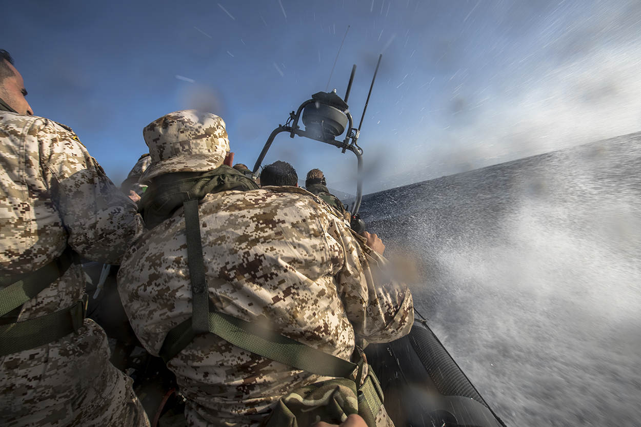 De cursisten maken op het helikopterdek kennis met de zeer snelle rubberboten, waarmee ze de volgende dag gaan werken. Mariniers kijken van een afstandje toe. Zij begeleiden de lessen en waken over de veiligheid aan boord. Ook bieden ze ondersteuning tijdens de trainingen op het water. “In het begin wisten we niet precies hoe we de Libiërs moesten benaderen”, begint eerste luitenant der mariniers Tom. “Ze moeten zich natuurlijk geen gevangene voelen, maar gast en partner. Het is de kunst daarin een goede balans te vinden. Daarvan merkten de trainees niets, want de juiste mindset hadden we al snel gevonden.”