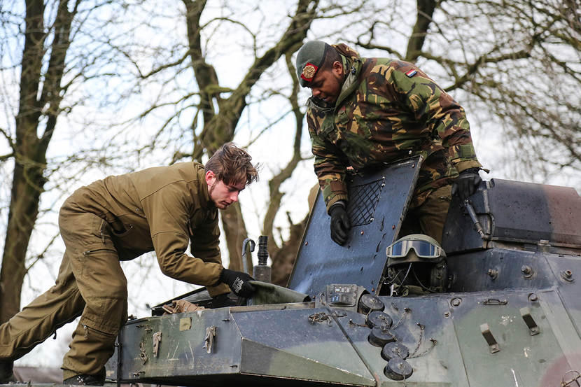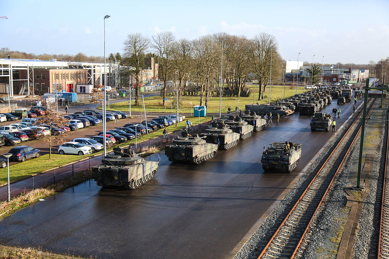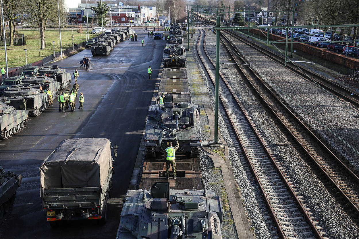 Afgelopen donderdag kwam de eerste lading pantservoertuigen van  45 Pantserinfanteriebataljon Regiment Oranje Gelderland aan in Duitsland. Hier oefent het bataljon nog anderhalve week samen met 414 Tankbataljon voordat het weer per trein doorgaat naar Polen. De rest van de treinen gaat rechtstreeks naar Het Poolse Drawsko. Een reis van zo’n 36 tot 48 uur. “We hebben geen prioriteit op het spoor”, zegt Strijker. “Beetje bij beetje verplaatsen de wagons richting het oosten.” Vanaf het station hoeven de voertuigen geen lange weg over het asfalt af te leggen. “Ze rijden daar zo het oefenterrein op.”
