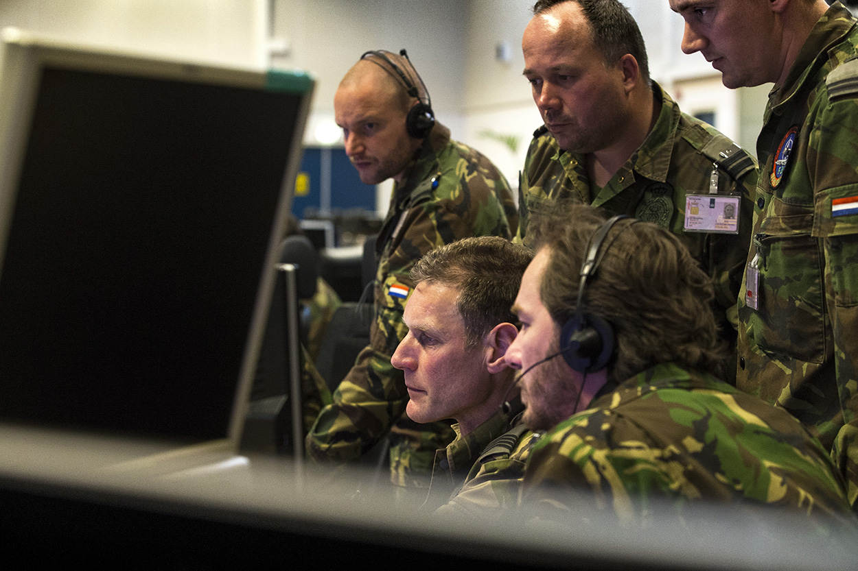 Niet alleen de 2 vliegbases zijn betrokken bij beide oefeningen. Die strekken zich uit over een groot deel van de luchtmacht en Defensie. Op het Air Operations Control (AOCS) Station Nieuw Milligen bijvoorbeeld, begeleiden zowel de militaire luchtverkeersleiding als de gevechtsleiding bij alle missies de vliegtuigen. Ook Deense en Duitse collega’s dragen hun steentje bij, net als de gemêleerde Europese bemanningen van de AWACS-radarobservatievliegtuigen die vanaf Geilenkirchen in Duitsland vliegen. Foto: Sergeant-majoor Gerben van Es