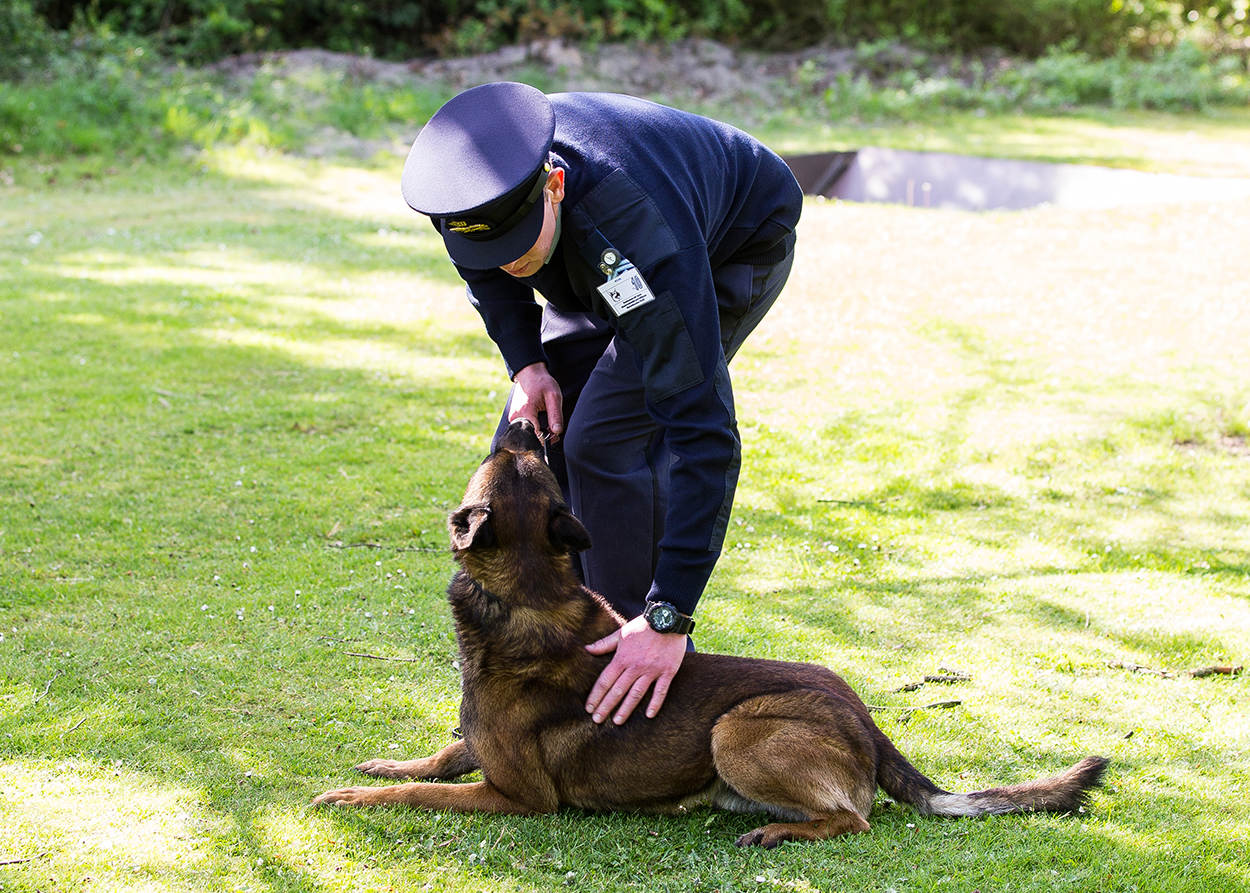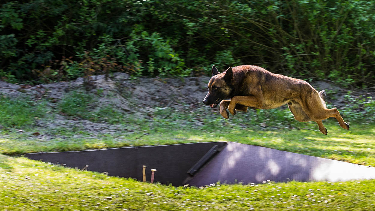 Op commando springt de viervoeter over kuilen en muurtjes. Doorzoekt hij het struikgewas. En schiet in sneltreinvaart af op zijn doelwit. Tanden blinkend in de zon. Onstuitbaar. Tot de baas zijn wapen tot de orde roept. Prijs je gelukkig als hij dat doet. “Bijten is een beloning”, merkt korporaal 1 Steffan op.