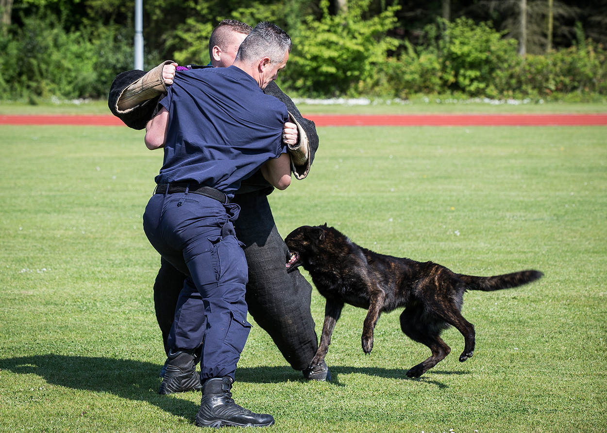 Bijten gebeurt alleen op commando. Althans, dat moeten ze hier laten zien. “Het is een eer om hieraan mee te mogen doen”, legt eerste bewaker Jonathan Bartsma uit, kijkend vanaf de zijlijn. De diversiteit aan vaardigheidsproeven houdt de spanning er tot op het laatst in, geeft zijn DBBO-collega Jelle de Jong aan. “Hoe meer onderdelen, hoe meer strijd.”