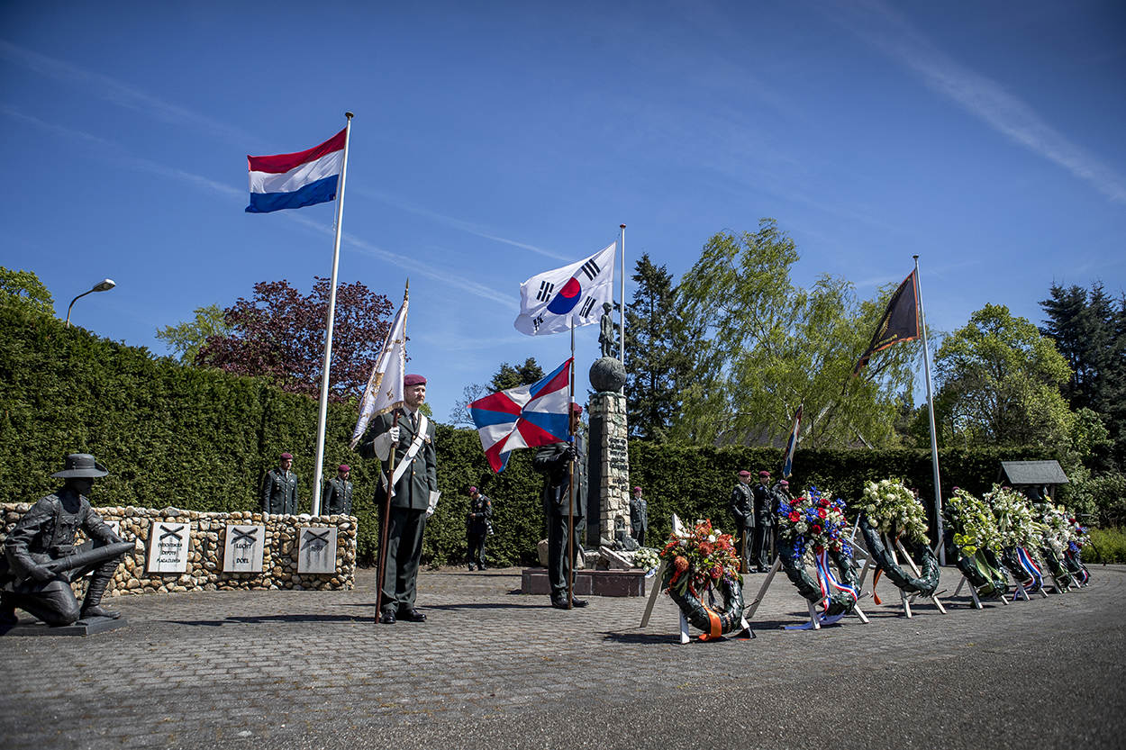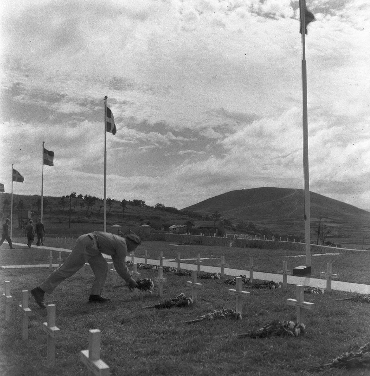 Een militair van het Nederlands Detachement Verenigde Naties legt bloemen bij de graven van omgekomen kameraden op Ereveld Tanggok bij Pusan.
