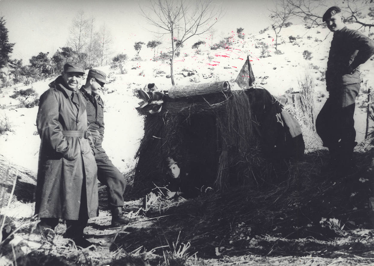 Luitenant-kolonel den Ouden, commandant van het Nederlands Detachement Verenigde Naties in Korea, bij een onderkomen dat de troepen door middel van stro tegen de kou beschermt.