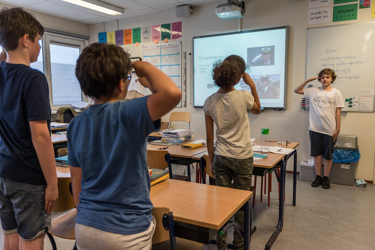 Luca beperkt zich ook niet alleen tot de informatie uit het pakket. “De hoogste onderscheiding is de Militaire Willems-Orde”, vertelt Luca zijn klas. “Die heeft Marco Kroon gekregen en hem heb ik een keer ontmoet”, voegt hij vol trots toe.