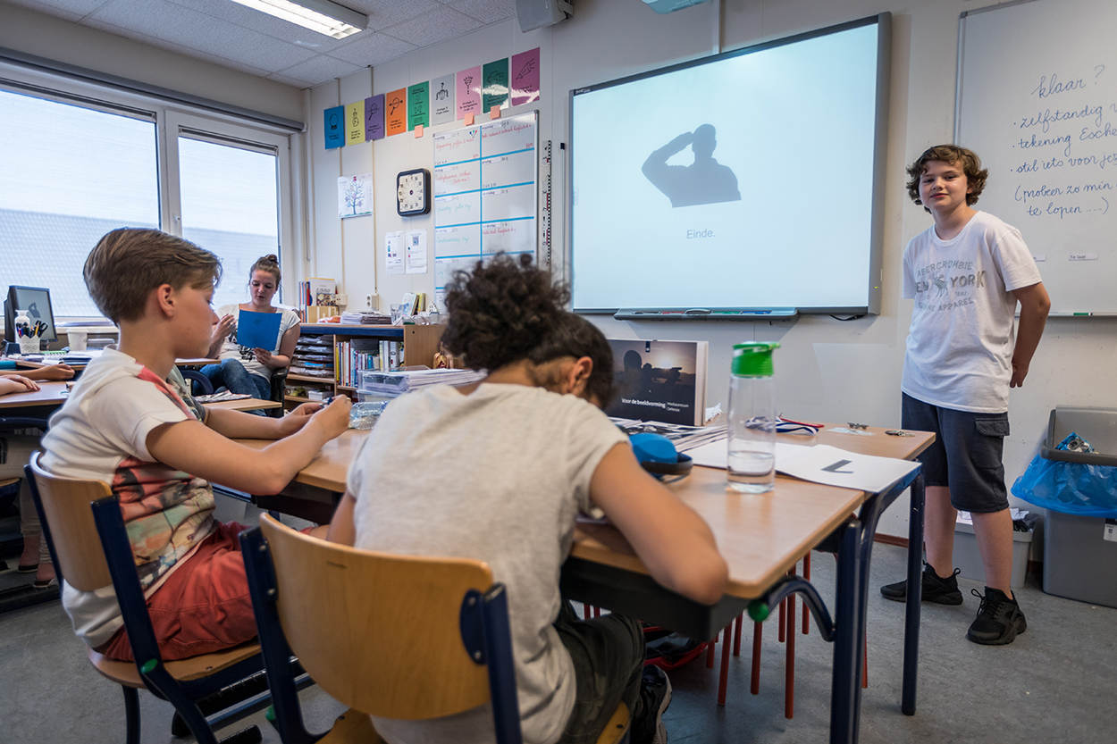 Luca betrekt zijn klasgenoten ook nadrukkelijk bij zijn spreekbeurt. “Nu ga ik jullie leren salueren meldt hij. Als een volleerd instructeur zet hij de klas in de houding en iedereen brengt enthousiast de groet zoals die staat geprojecteerd op het schoolbord. Een korte quiz vormt het besluit van de presentatie. De reacties zijn zeer positief. “Ik heb er veel van geleerd”, reageert Mitchell. “Je had iets rustiger kunnen beginnen en misschien iets harder moeten praten”, oordeelt Eva. “Het zat goed in elkaar en duurde ook niet te lang meldt een ander.”