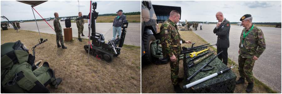 Tussen de lezingen door kon het publiek kennismaken met de nieuwste snufjes op het gebied van Counter-IED. Via een virtual reality bril konden belangstellenden rond een gebombardeerde auto ‘lopen’. Wetenschappers van onderzoeksinstituut TNO hadden het beeld samengesteld uit 30 foto’s van de plaats delict; een handig hulpmiddel bij onderzoek. Ook was er nieuw lesmateriaal te bewonderen voor genisten. Via een sensor op hun metaaldetector kunnen zij binnenkort op een beeldscherm zien welk terrein ze hebben ‘gesweeped’ en of ze dat op de juiste hoogte en met de juiste snelheid hebben gedaan.