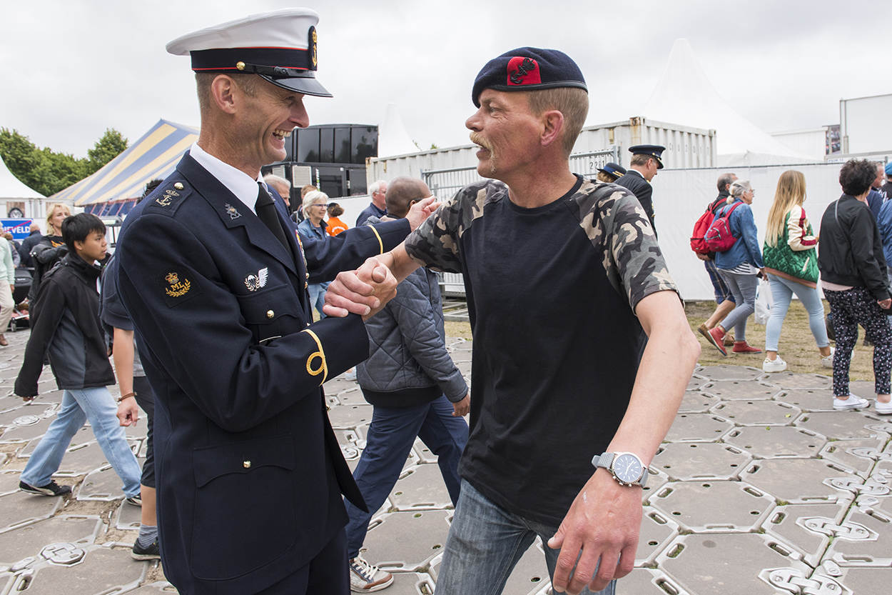 Ed, linksachter me, is er juist vanaf de eerste Veteranendag bij. Met zijn olijfgroene hoofddeksel en embleem van de Jagers valt hij op tussen alle rode en blauwe baretten. Ed heeft bovendien het draaginsigne gewonden opgespeld. “Ik ben gewond geraakt in Libanon (UNIFIL, 1979-1985). Bij een explosie in de schouder geraakt door een rondvliegend stuk steen.” Hij legt daarbij een relatie naar de huidige woelige tijden. “In feite is het niet zo anders dan toen. Ook wij hadden te maken met aanslagen. Een maat van me is omgekomen doordat zijn voertuig over een meelzak reed, waarin een mijn zat. Dat nieuws kwam niet zo snel door als nu.”