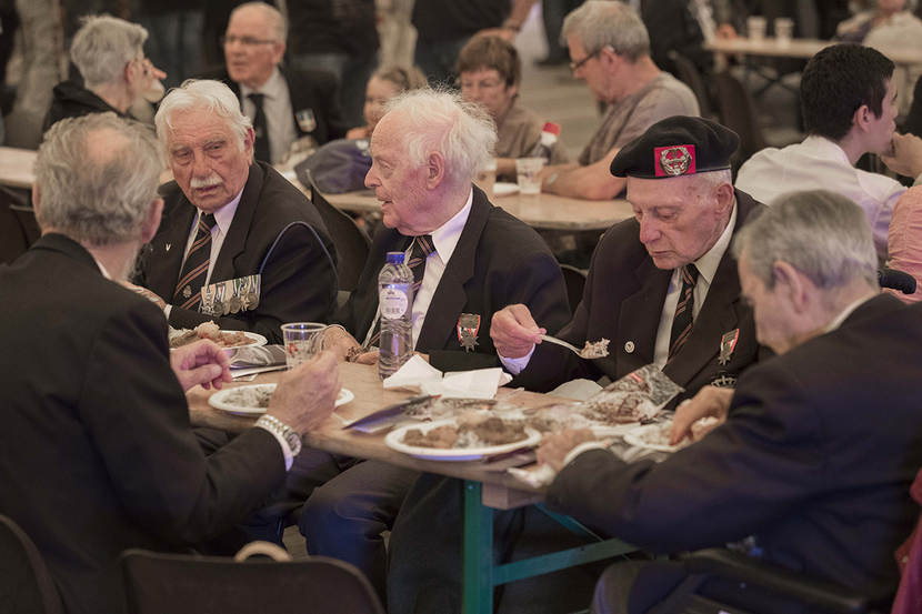 Oude veteranen aan de rijstmaaltijd in één van de tenten op het Malieveld.