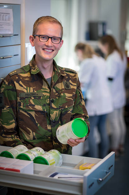 Eens per maand verruilt hij zijn kantoor op de Utrechtse Kromhoutkazerne voor de Centrale Militaire Apotheek in Utrecht. De farmaceutische afdeling die door vrijwel alleen maar vrouwen wordt bemand. “Hier controleer ik vooral recepten, zodat patiënten op een juiste manier geneesmiddelen gebruiken. Het is ontzettend leuk hier af en toe heen te gaan.”