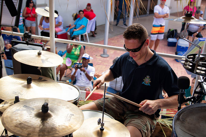 Tamboer Van de Velde drumt ook bij de Steelband, zoals hier op Aruba