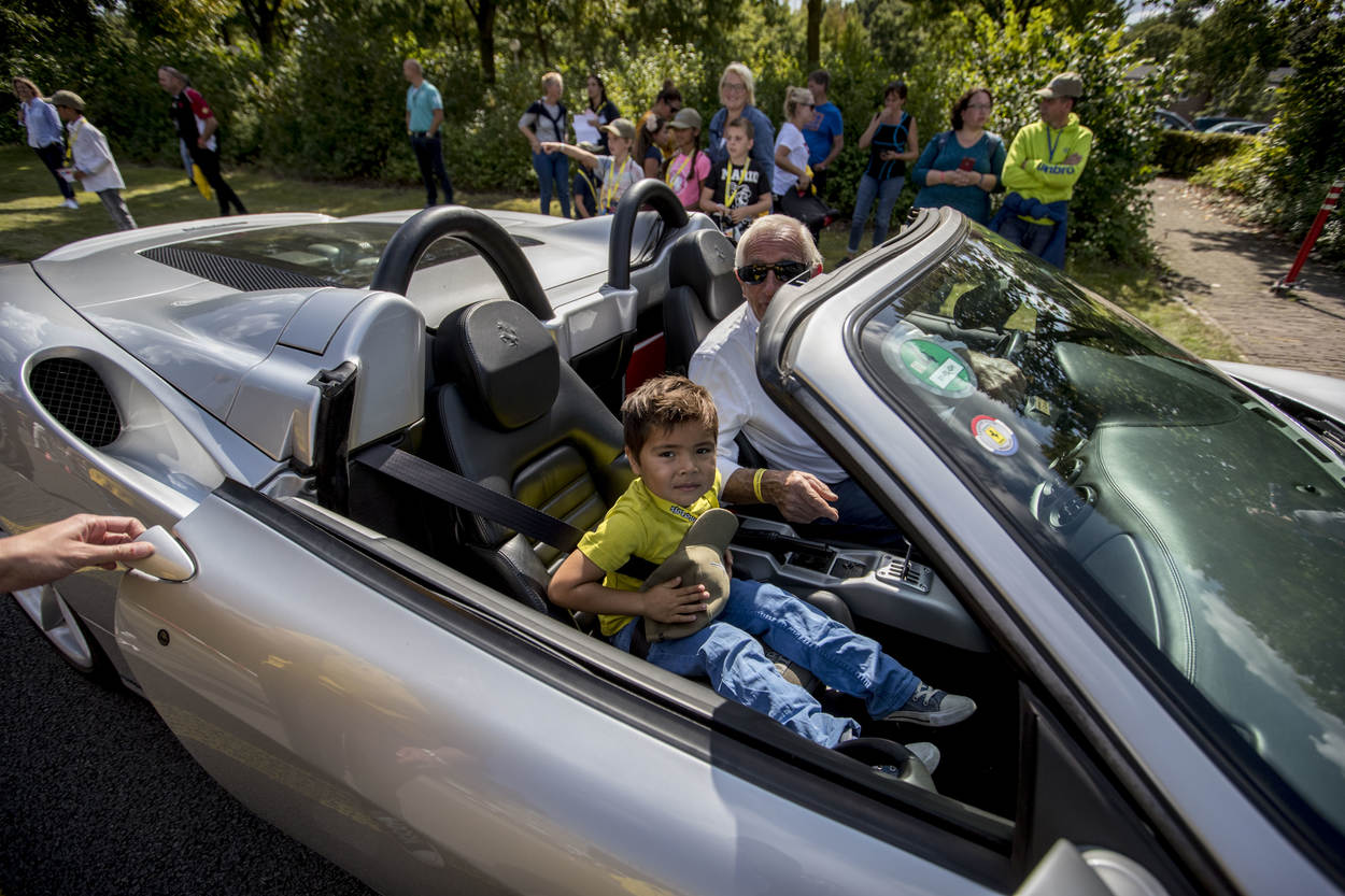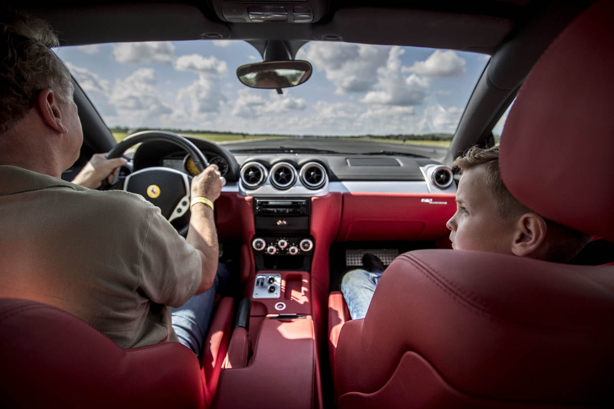 Ondanks het kinderzitje in deze Ferrari komt het hoofd van Arie maar net boven het dashboard uit.  “We gingen heel hard”, roept de kleuter nog voordat de wagen stil staat. “En de auto maakt ook heel veel geluid.”