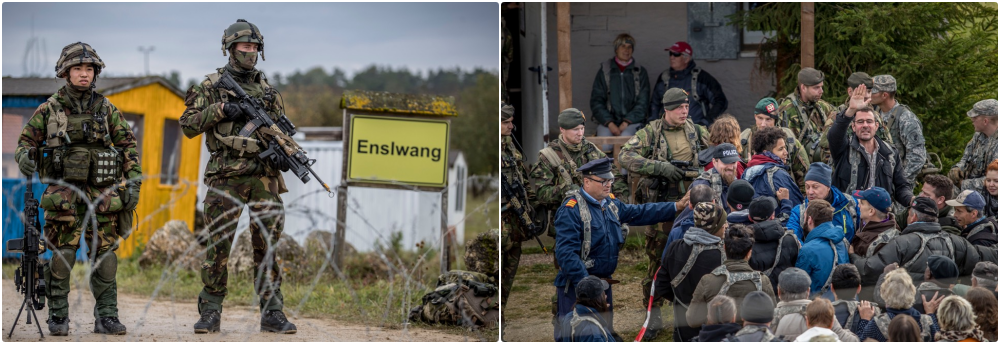 Ruhe, ruhe.” Onder het oog van militairen van de Bravo-compagnie van 17 Pantserinfanteriebataljon probeert de driftig gebarende burgemeester van het oefendorp Enslwang de opdringende menigte te kalmeren. De vijand, Torrikans, rukt op. Iedereen moet worden geëvacueerd. De deze week beëindigde NAVO-oefening Swift Response draaide naast luchtmobiele operaties ook om evacuatietrainingen. ”Win sympathie.