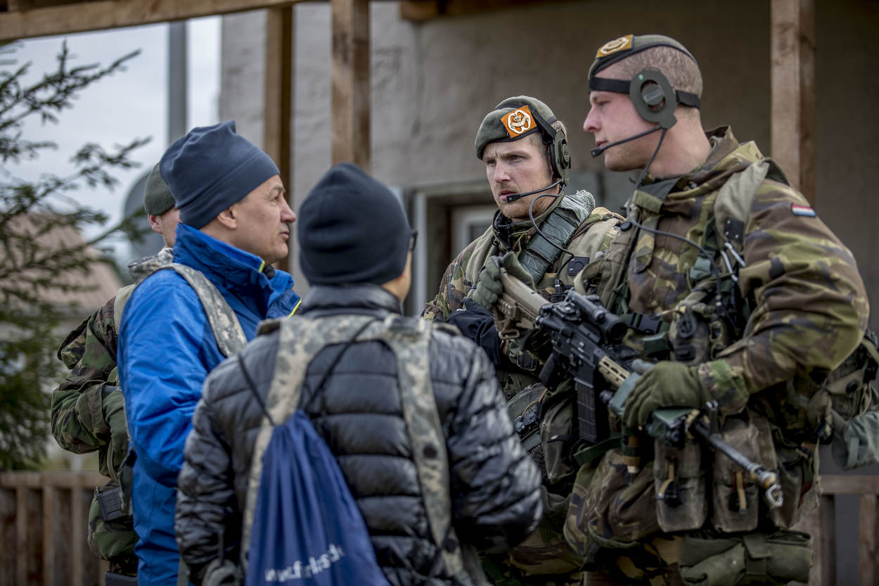 Wie niet meewerkt, moet het ‘toneel’ verlaten. De acteurs speelden hun rol vaak heel realistisch. Nederlandse militairen houden het geheel in de gaten.
