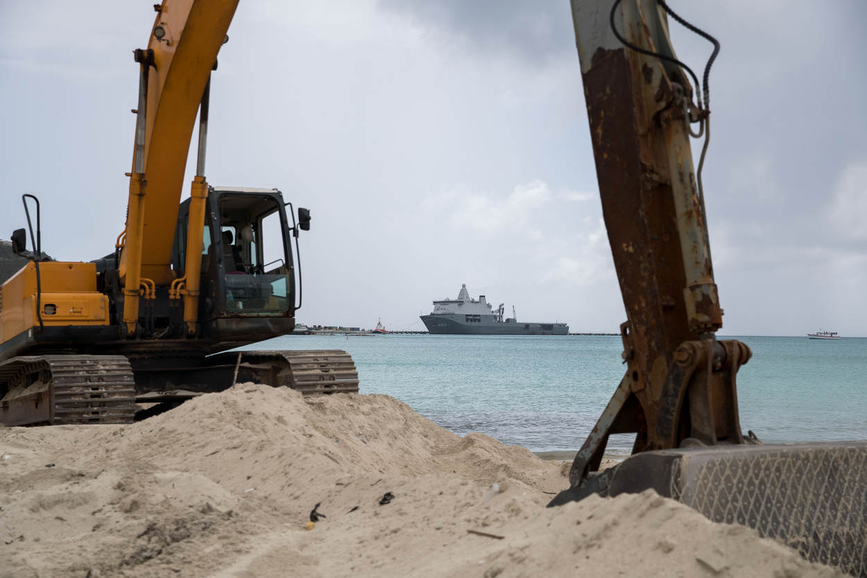 Met man en macht wordt gewerkt aan de wederopbouw van Sint Maarten. Op de achtergrond Zr. Ms. Karel Doorman die begin deze maand een grote lading hulpgoederen afleverde.