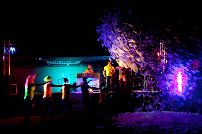 Het ‘sneeuwt’ op het Treurenburgplein op Kamp Castor. Hard werken, hard ontspannen.