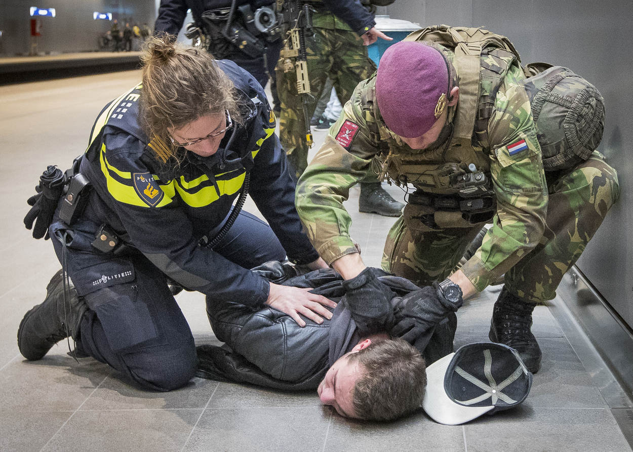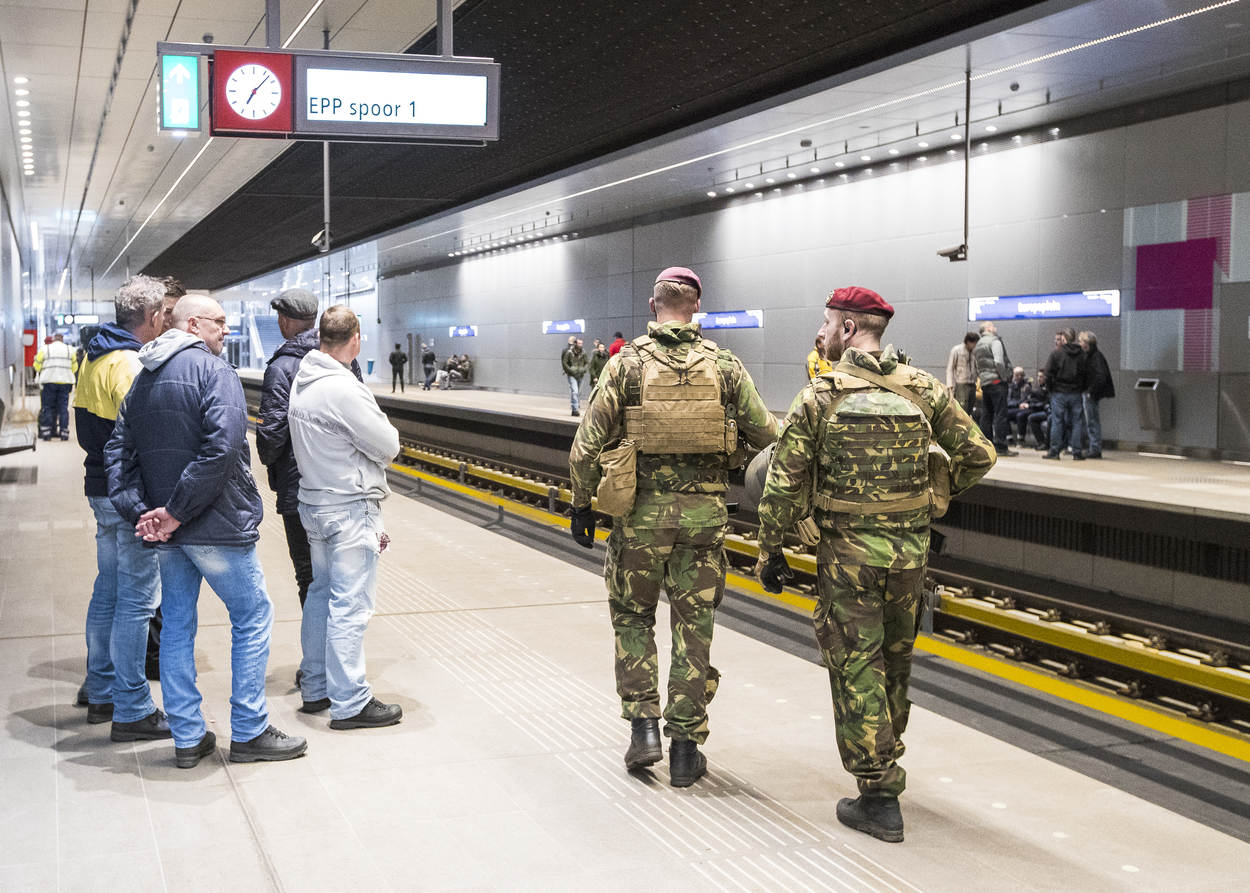 “Zo, dat zijn serieuze geweren”, roept een voorbijganger. In de buurt van de Amsterdam RAI maakt een peloton militairen zich gereed om de beveiliging van metrostation Europaplein over te nemen van de politie. De zwaar bewapende specialisten trekken bekijks. De hoofdstad was vorige week het toneel van een grootschalige terreuroefening.