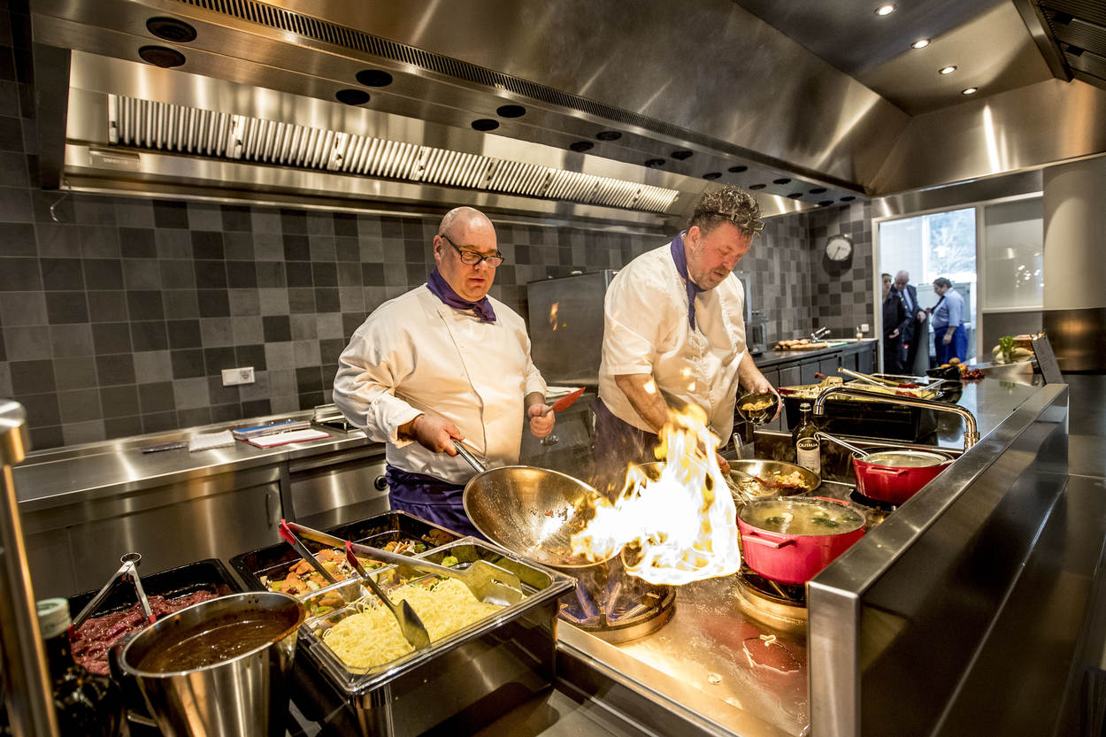 Dieetkok Wim van Viegen (links): “Dit is schitterend. Ik werk 32 jaar op het MRC. We begonnen ooit met 1 menu. Nu staan we a la minute te wokken met de mooiste verse producten. Ik voel me nu veel meer kok.”