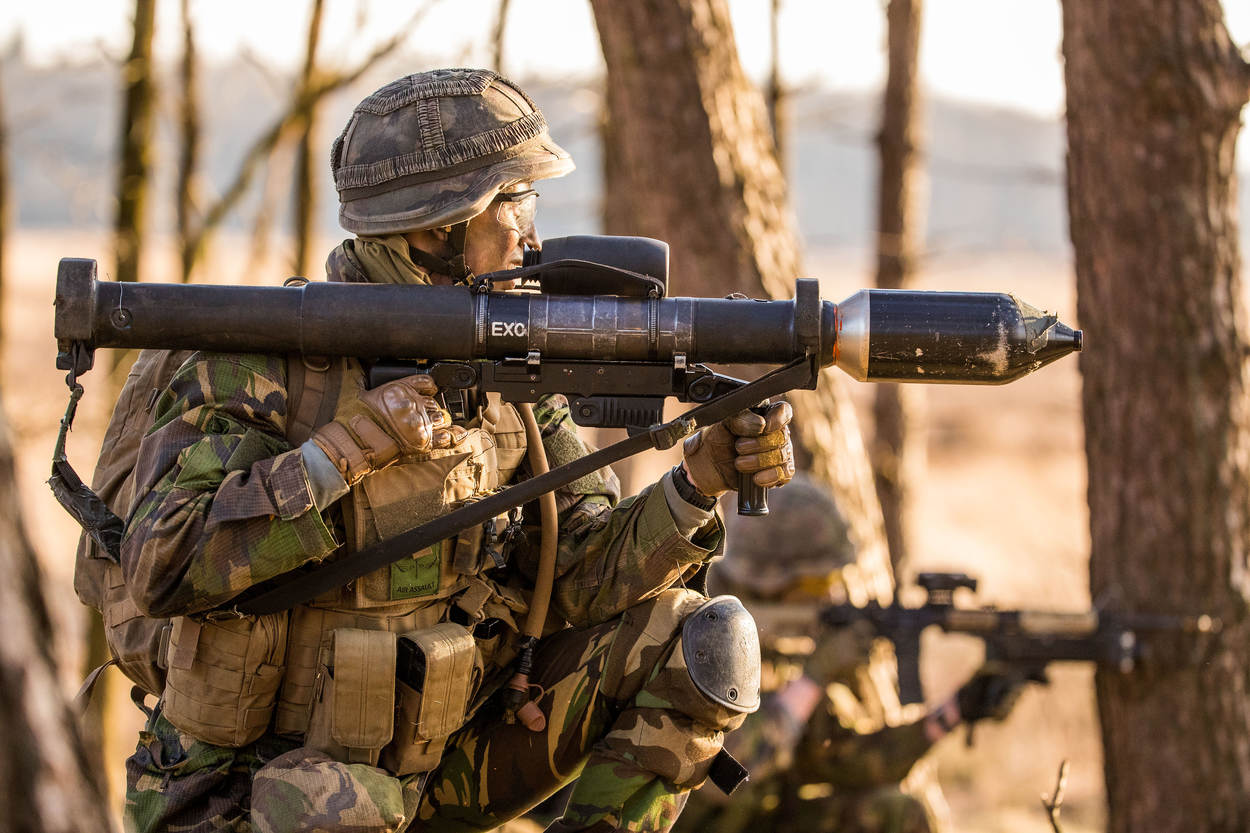 Een loadmaster van 11 Luchtmobiele Brigade oefent met een Panzerfaust, tijdens een loeizware opleiding op vliegbasis Deelen (foto: korporaal Jasper Verolme).