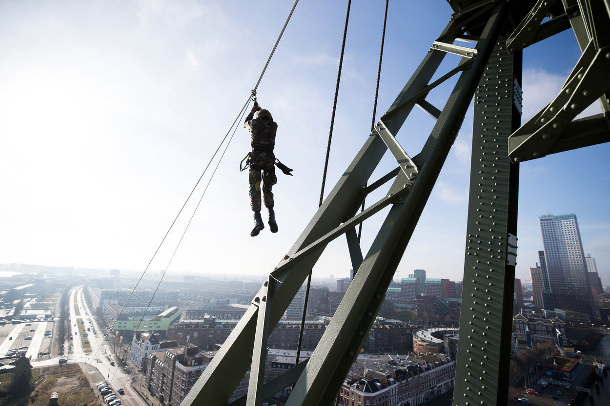 Een nieuwe lichting jongemannen heeft na een aantal loodzware maanden de mariniersopleiding in Rotterdam afgesloten. De havenstad is traditiegetrouw het decor van deze Elementaire Militaire Vorming Mariniers en de eindoefening 'Final Exercise' (foto: korporaal Jasper Verolme).