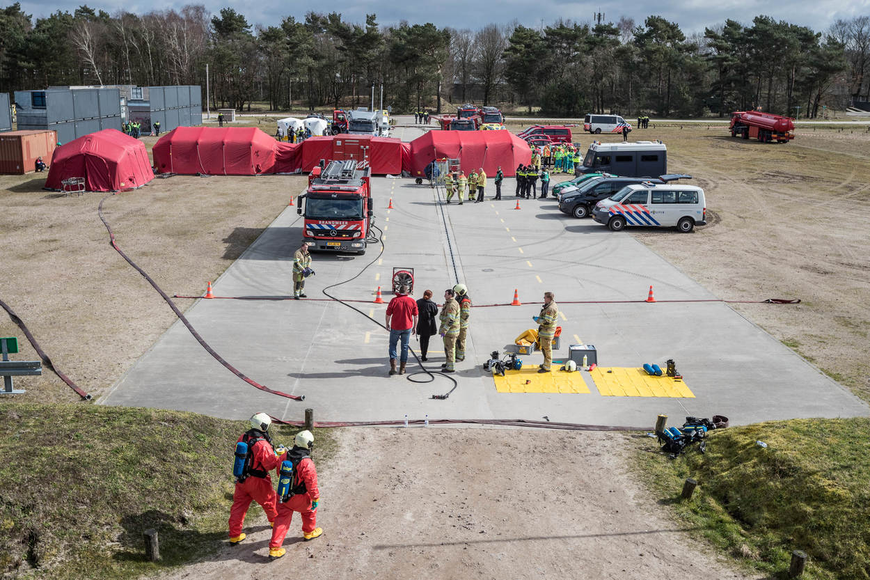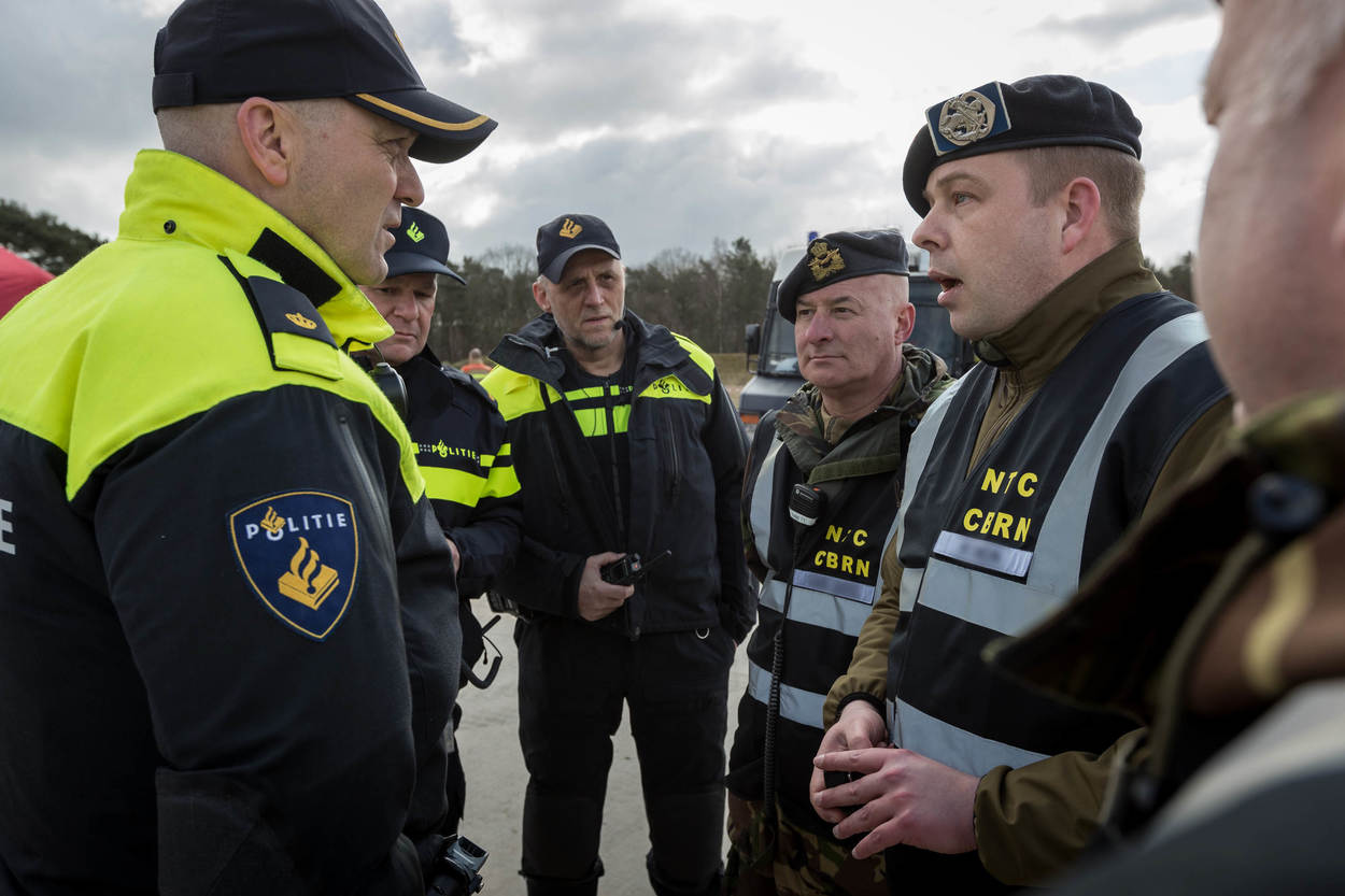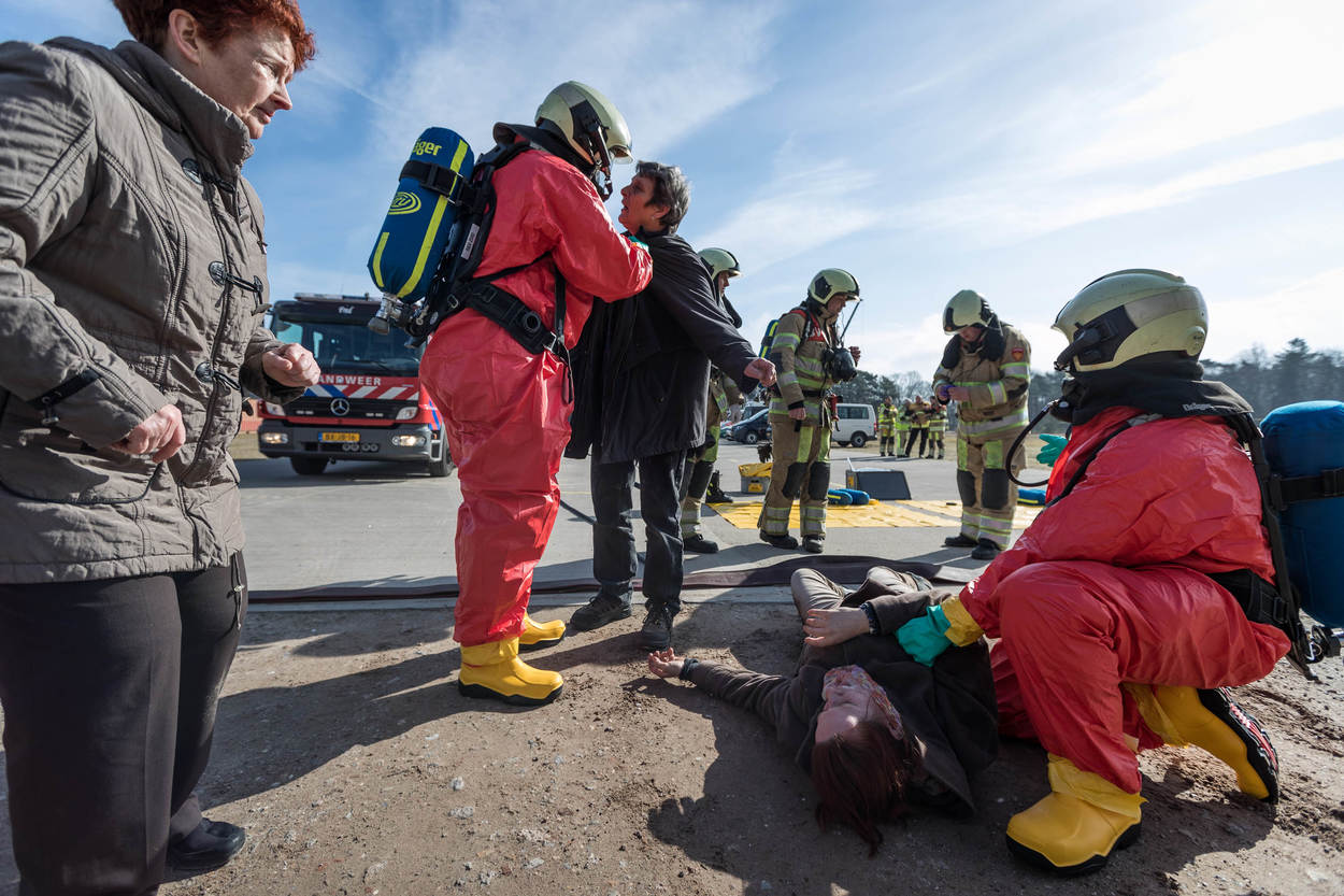 Dan komt de stroom verschillende uniformen op gang. Brandweer, GGD, ME, marechaussee, RIVM en de CBRN Respons Eenheid van Defensie. Het doel: samenwerken. Dat is best lastig met zoveel spelers. Iedereen wil hetzelfde, maar doet dat net op een andere manier. “Welk gebied rond de aanslag is veilig? Wie geeft het gebouw vrij? Daar moeten tussen de civiele partners en Defensie duidelijke afspraken over bestaan. Dat trainen we vandaag”, aldus Robert Raben van de Brandweer Flevoland.