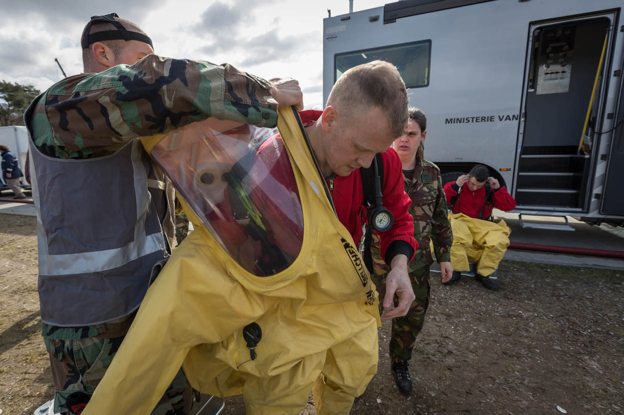 De CBRN Respons Eenheid van Defensie bereidt zich bij hun hypermoderne bus voor op de verkenning. Onder het gele pak dragen ze een gasmasker met een zuurstoffles die 45 minuten lucht geeft.