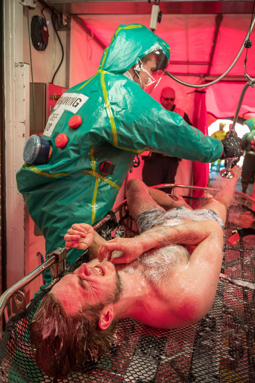 Een medewerker van de Grootschalige Ontsmettingseenheid van de brandweer reinigt een slachtoffer dat besmet is met een zenuwgas. In de grote ontsmettingsstraat worden tientallen mensen tegelijk behandeld.