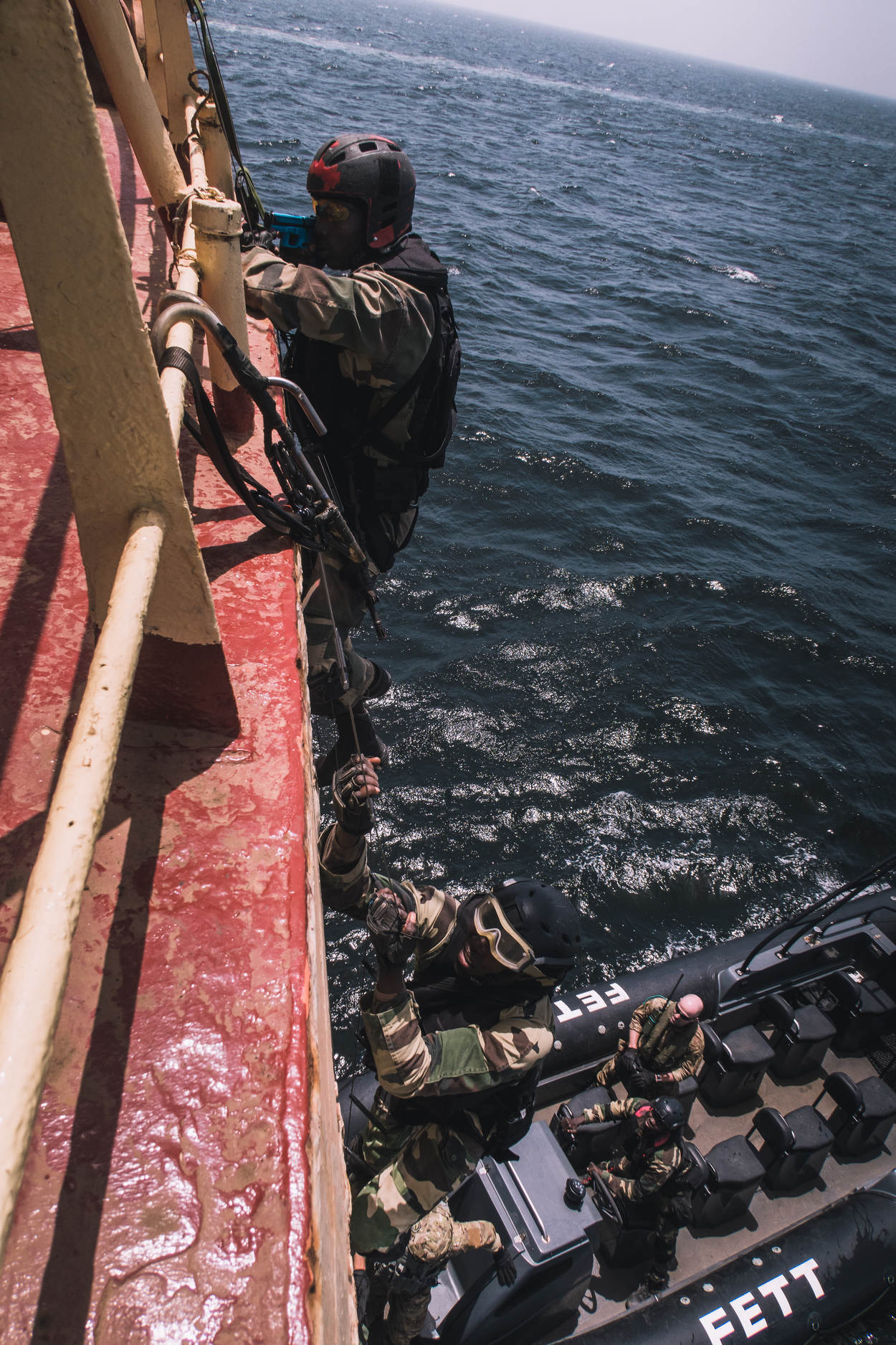Een militair klimt onder toeziend oog van een MARSOF-operator aan boord via een speleoladder.