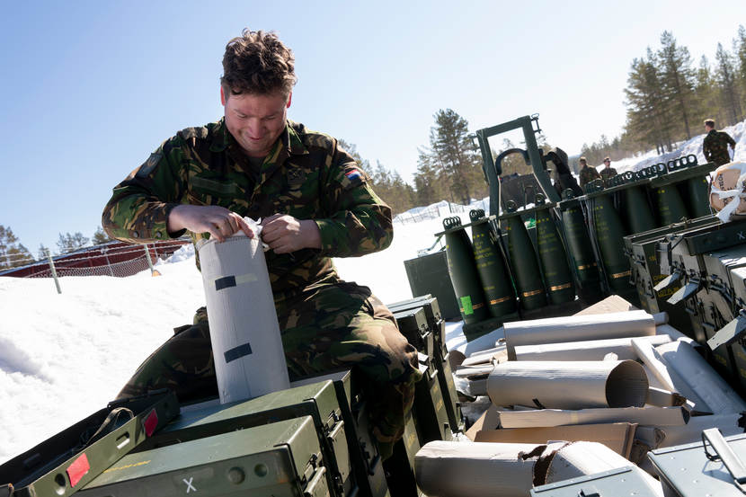 Hij werkt al 7 jaar bij de munitie bewakingsgroep, maar vandaag levert Simon extra handjes in het veld. “Dit noemen we de munitiedump: de plek in het veld waar de Pantserhouwitsers komen bunkeren. Ze laden nu 48 granaten high explosive, dat zijn beste bommen die ze niet in Duitsland mogen verschieten vanwege het lawaai. Ik help mee met het 'preppen': het prepareren van de kardoezen, de zakken kruit die achter de granaat komen te liggen zodat die afgevuurd kunnen worden. Lading 8, nummer 13 C1. Klinkt geheimzinnig, is gewoon de code van de standaard lading. Ik haal de kardoezen uit hun verpakking, touwtjes eraf en maak ze schietklaar. Genoeg werk vandaag, want ze knallen er lustig op los. Ja, ik zit er lekker bij: zonnetje op de kop, mooie natuur, fraai sneeuwlandschap. Best naar mijn zin deze oefening!”